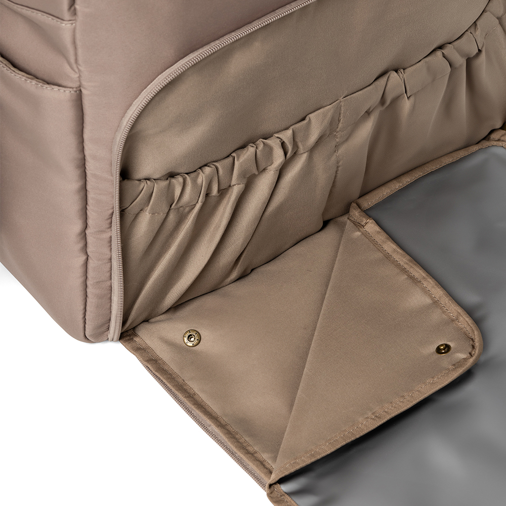 Tasken har to lommer foran, der giver let adgang til ting, du ofte har brug for, mens de to korte remme og en lang, justerbar skulderrem giver alsidige bæremuligheder. Det medfølgende pusleunderlag kan nemt foldes ud, hvilket gør bleskift til en leg, uanset hvor du befinder dig.