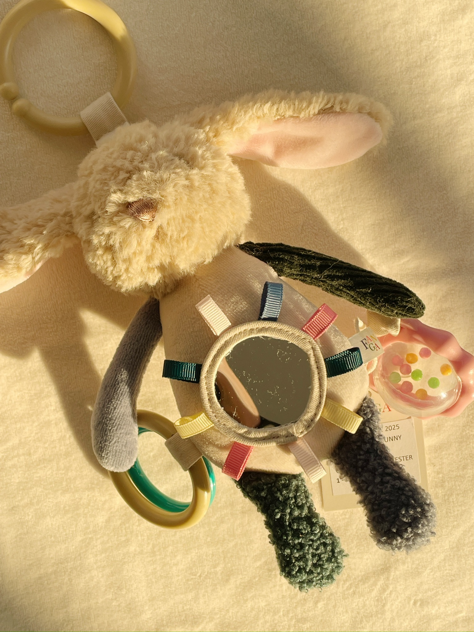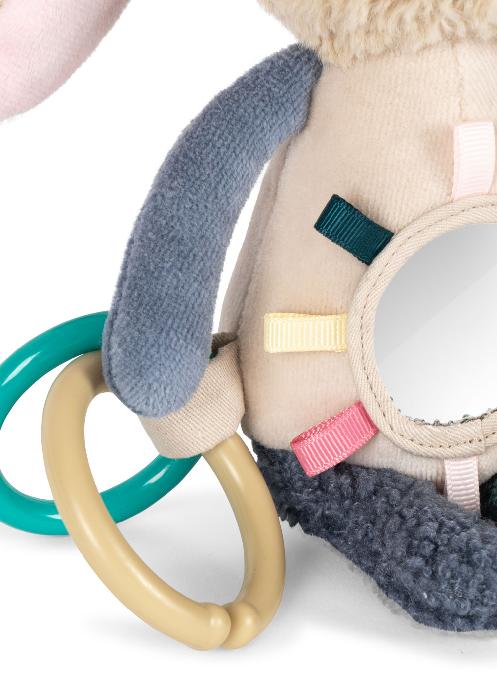 Peluche Bunny Rangle fra Fanga Fontana er det ideelle sanselegetøj til dit barn fra 0 år og opefter. Denne yndige rangle er designet med små hænder i tankerne, hvilket gør det nemt for de mindste at gribe og holde fast. Med sine forskellige teksturer inviterer ranglen til udforskning og stimulering af sanserne, hvilket er en vigtig del af dit barns tidlige udvikling. Ranglens indbyggede raslefunktion tiltrækker dit barns opmærksomhed og skaber glædelig underholdning. Det er ikke kun en rangle, men også et alsidigt legetøj, der inkluderer et lille spejl og et praktisk håndtag. Disse elementer giver mulighed for ekstra sjov og leg, mens spejlet introducerer dit barn til sit eget spejlbillede. Peluche Bunny Rangle er en perfekt gaveidé, der kombinerer læring og leg, og giver dit barn en fantastisk første oplevelse med sanselegetøj.