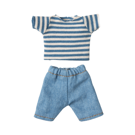 - Iklædt blåstribet t-shirt og denimbukser