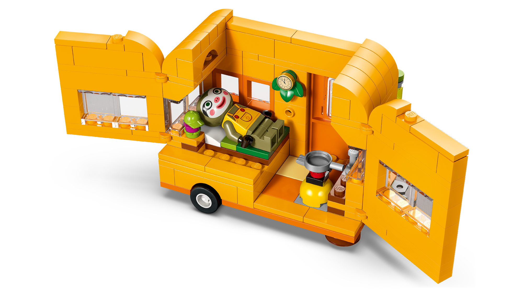 Legesæt med et alsidigt køretøj – Campingvognens sider kan åbnes, så legen kan fortsætte indenfor, og børn kan sætte Leif til rette, når han har tilberedt et måltid med friske grøntsager på komfuret.