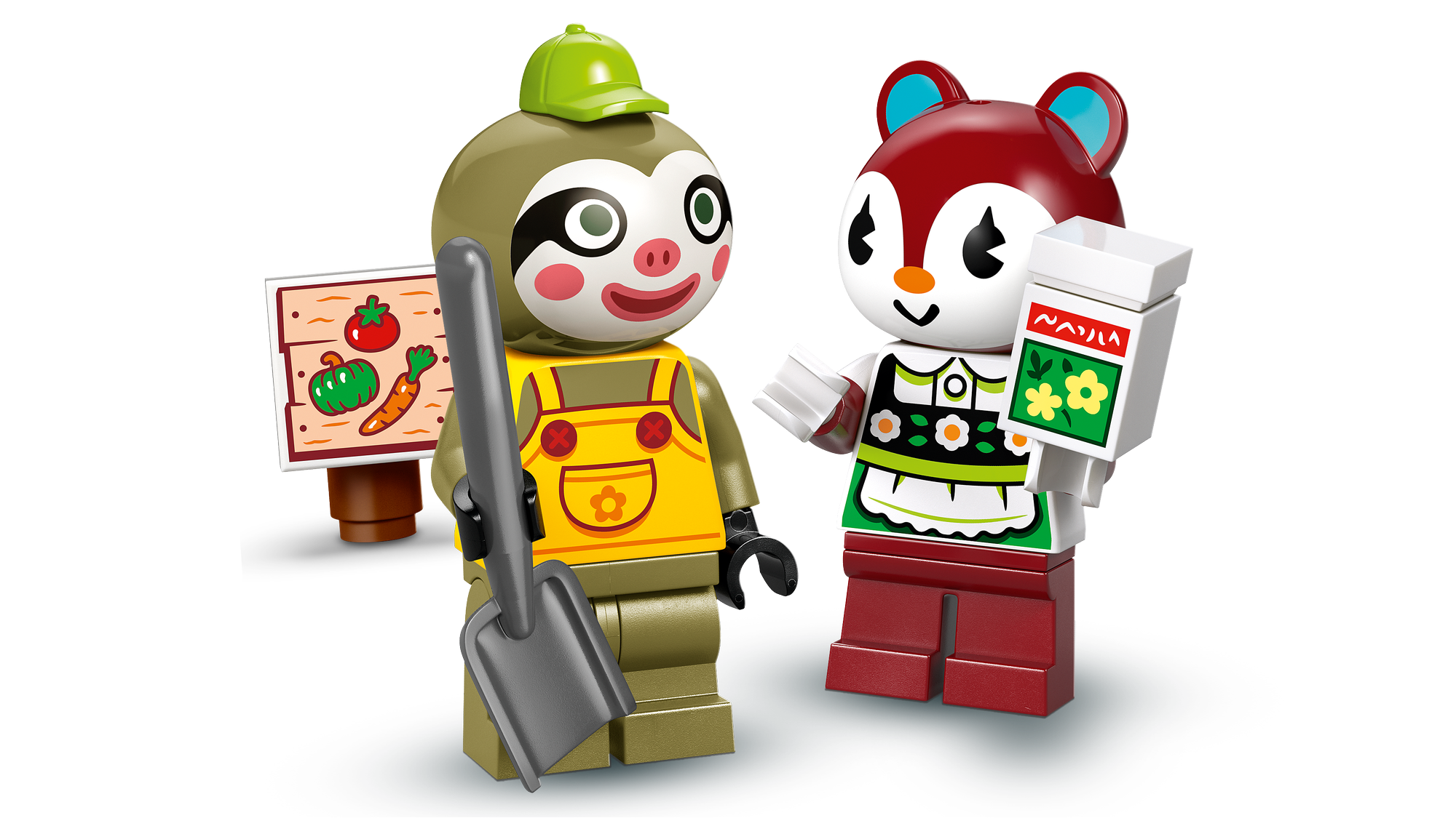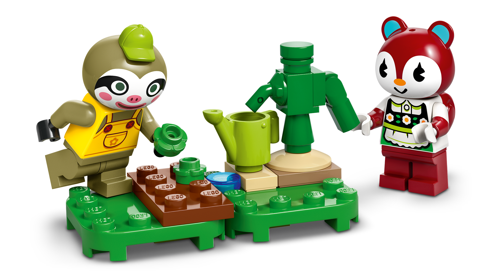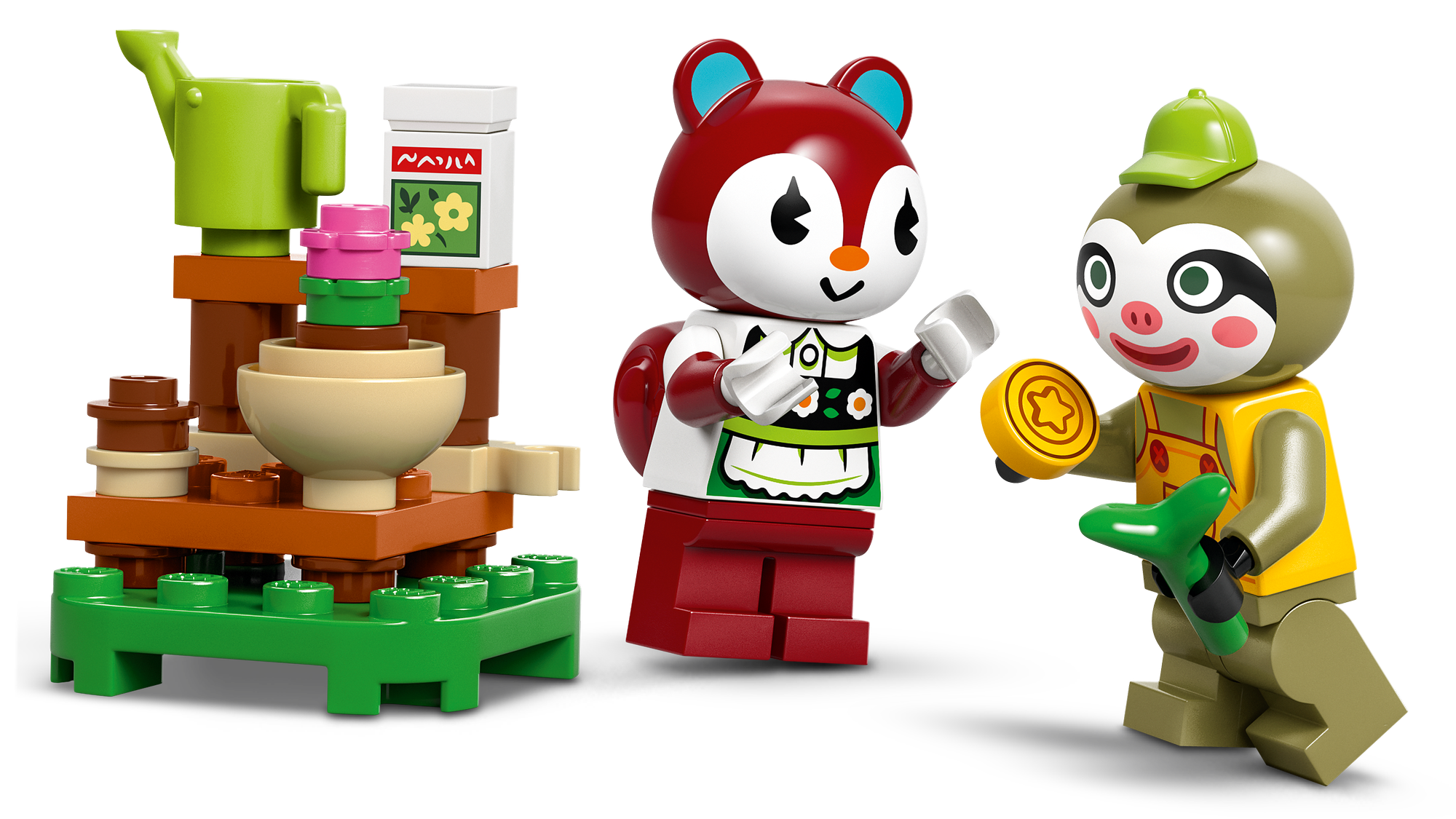 2 LEGO® minifigurer fra Animal Crossing™ – Legesættet med havebutik indeholder en minifigur af dovendyret Leif og en minifigur af egernet Poppy fra videospilserien.
