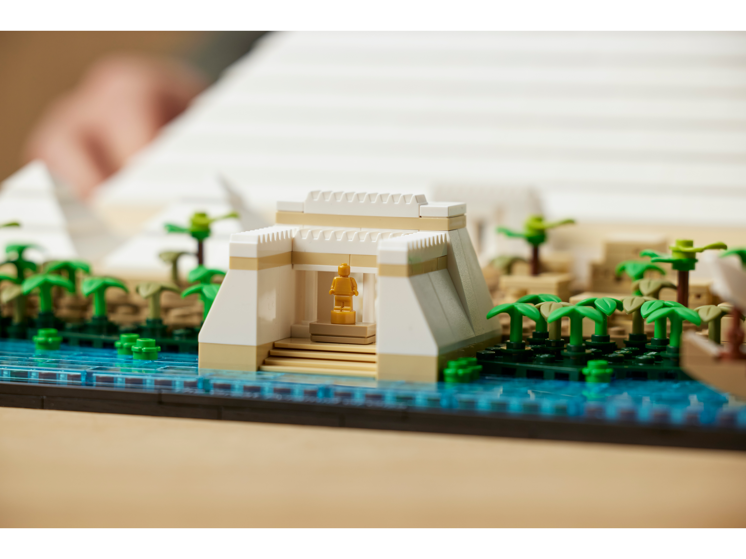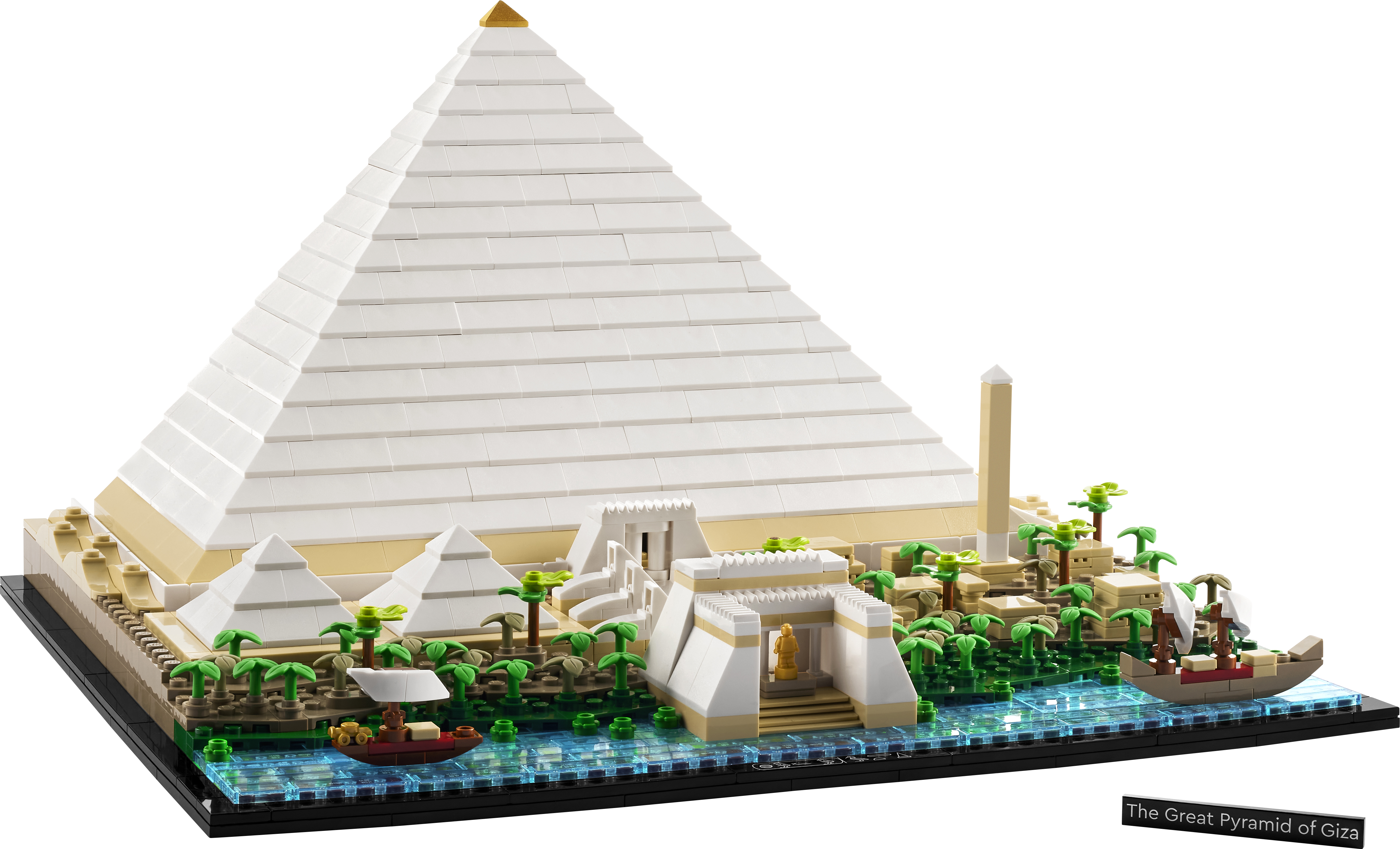 Detaljeret landskab – En del af Nilen med 2 LEGO® klodsversioner af feluker (gammeldags både), 2 små pyramider, 2 dødstempler, sfinx-statuer, en landsby til arbejdere og en obelisk