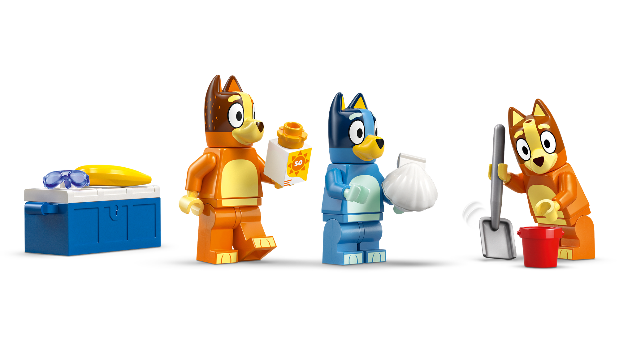 Interaktivt byggelegetøj til børn – Det sjove legesæt indeholder LEGO® minifigurer, et legetøjskøretøj og masser af praktiske aktiviteter til en sjov dag på stranden med Bluey, Bingo og deres mor.
