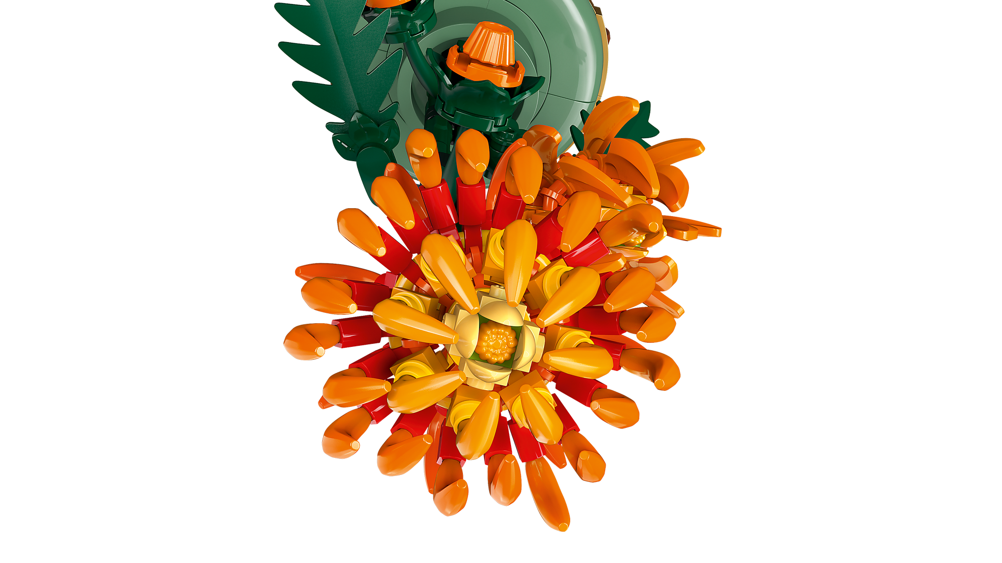 Blomstrende knopper – LEGO® Icons Krysantemum med poserbare blade og kronblade indfanger den flotte orange blomst i forskellige stadier, nemlig 1 i fuldt flor, 1 blomstrende og 2 i knop
