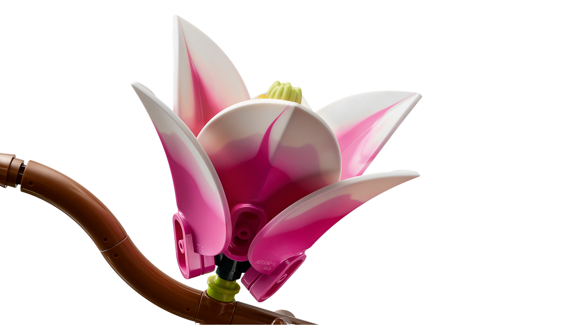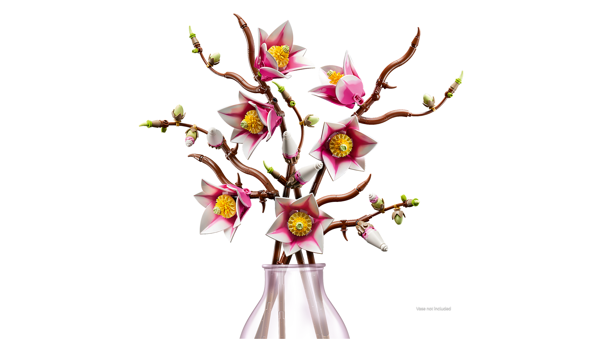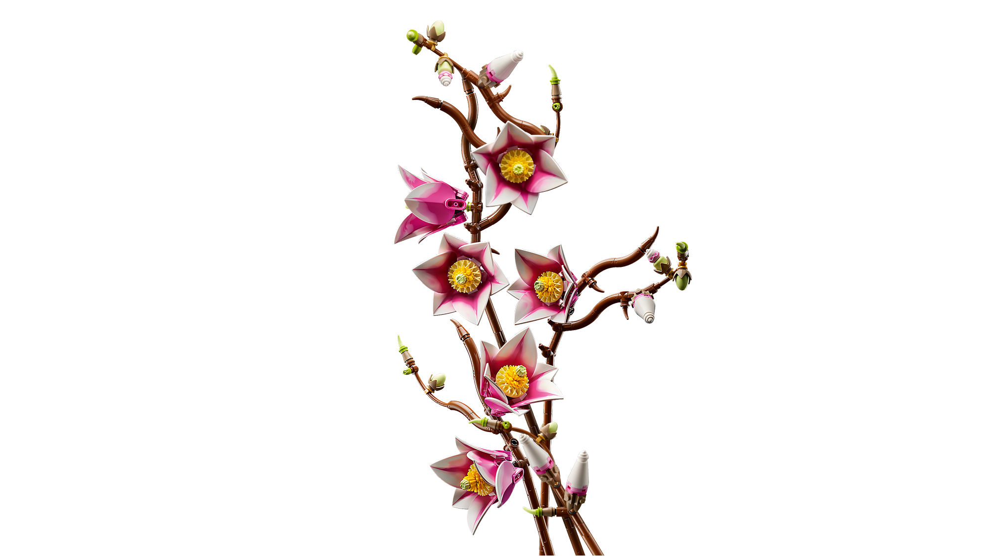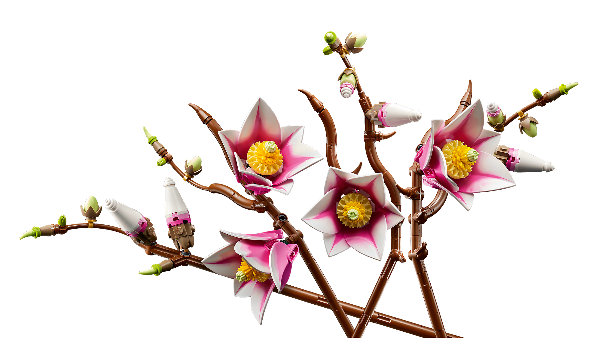 LEGO® Magnoliaer – Byggesættet indeholder 5 magnolia-grene, hvoraf 2 viser blomstens fulde udvikling fra en lille knop til en åben blomst med udfoldede kronblade.