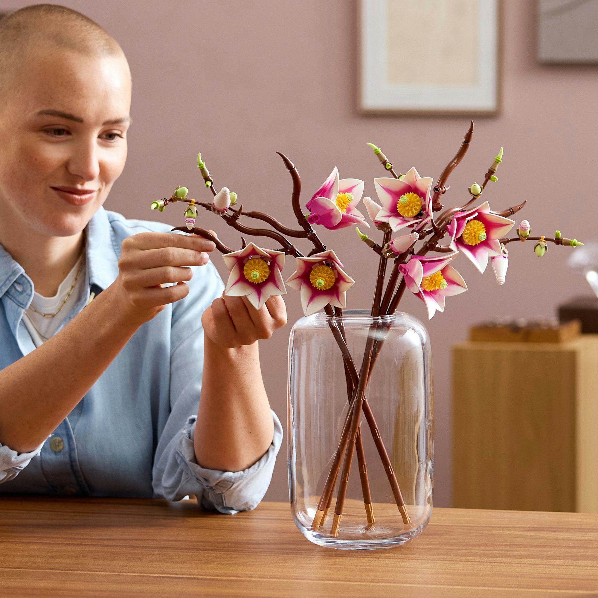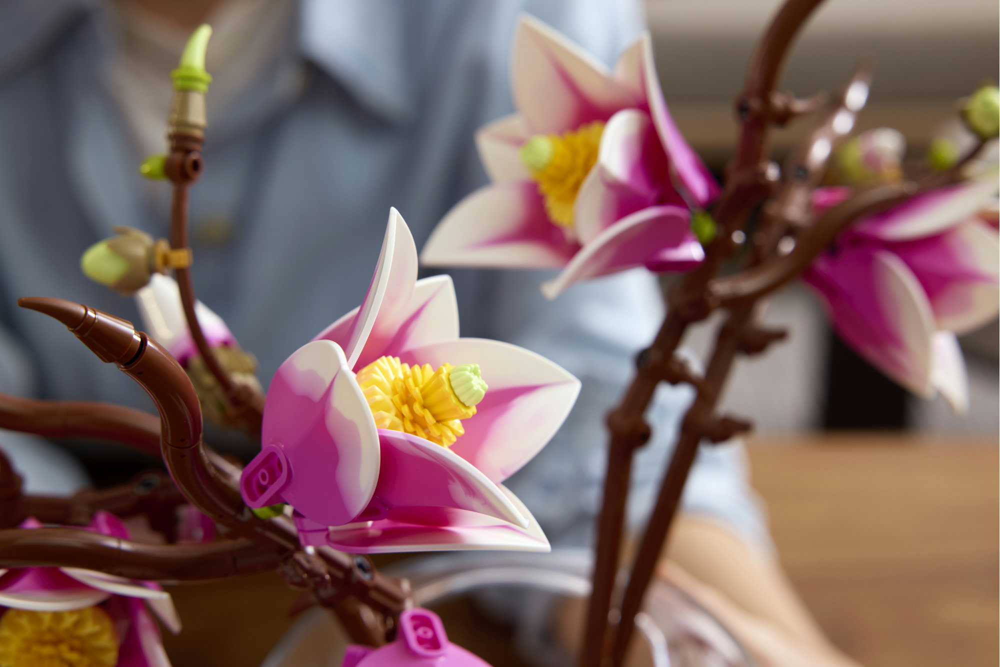 Pynt med blomstertema – Når magnolia-grenene er bygget, kan de indgå som en del af indretningen i hjemmet og kombineres med andre LEGO® Botanicals sæt (sælges separat) for at skabe en stor og unik udstilling.