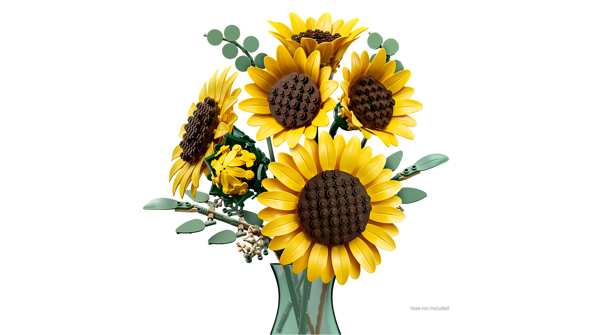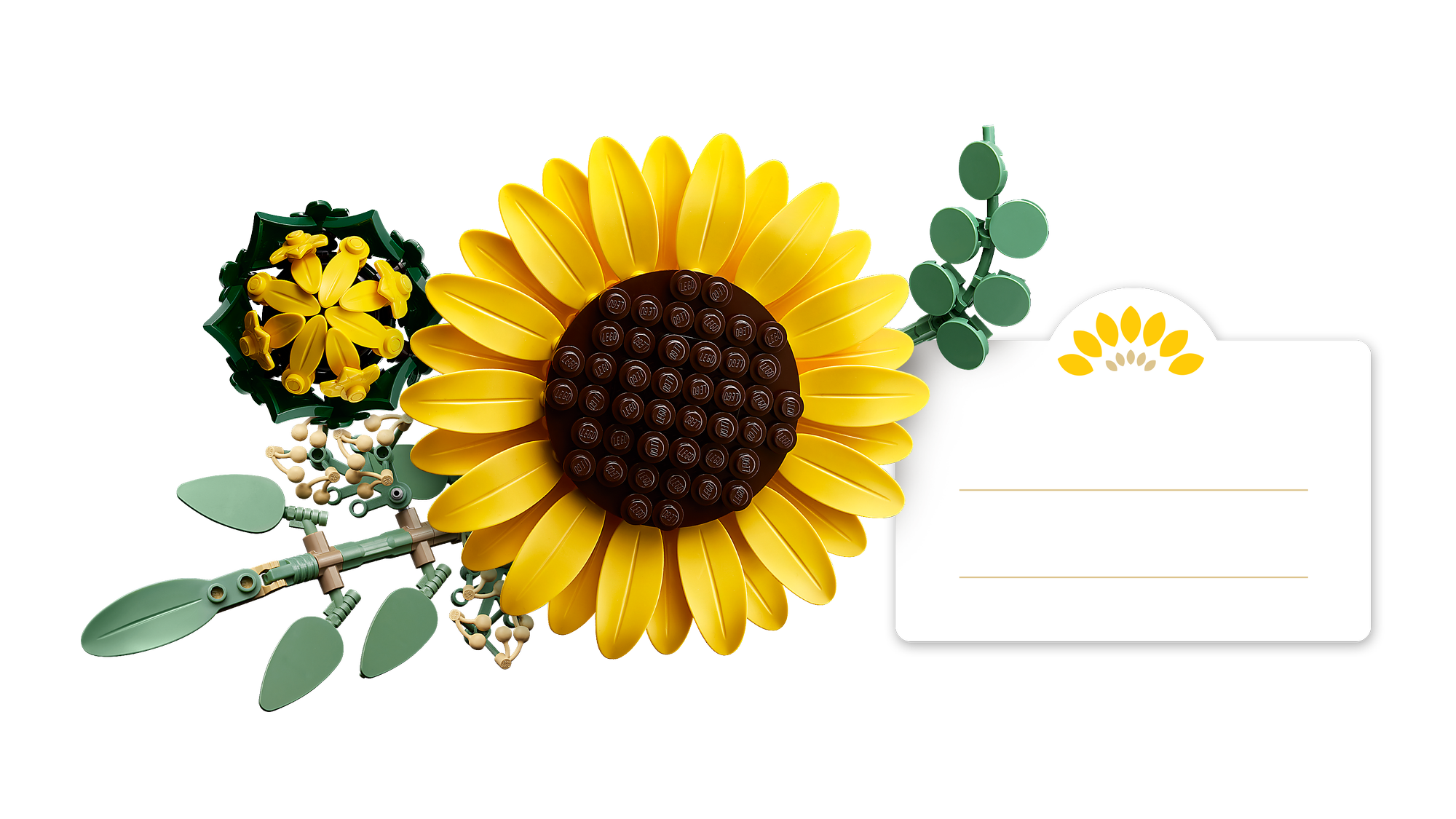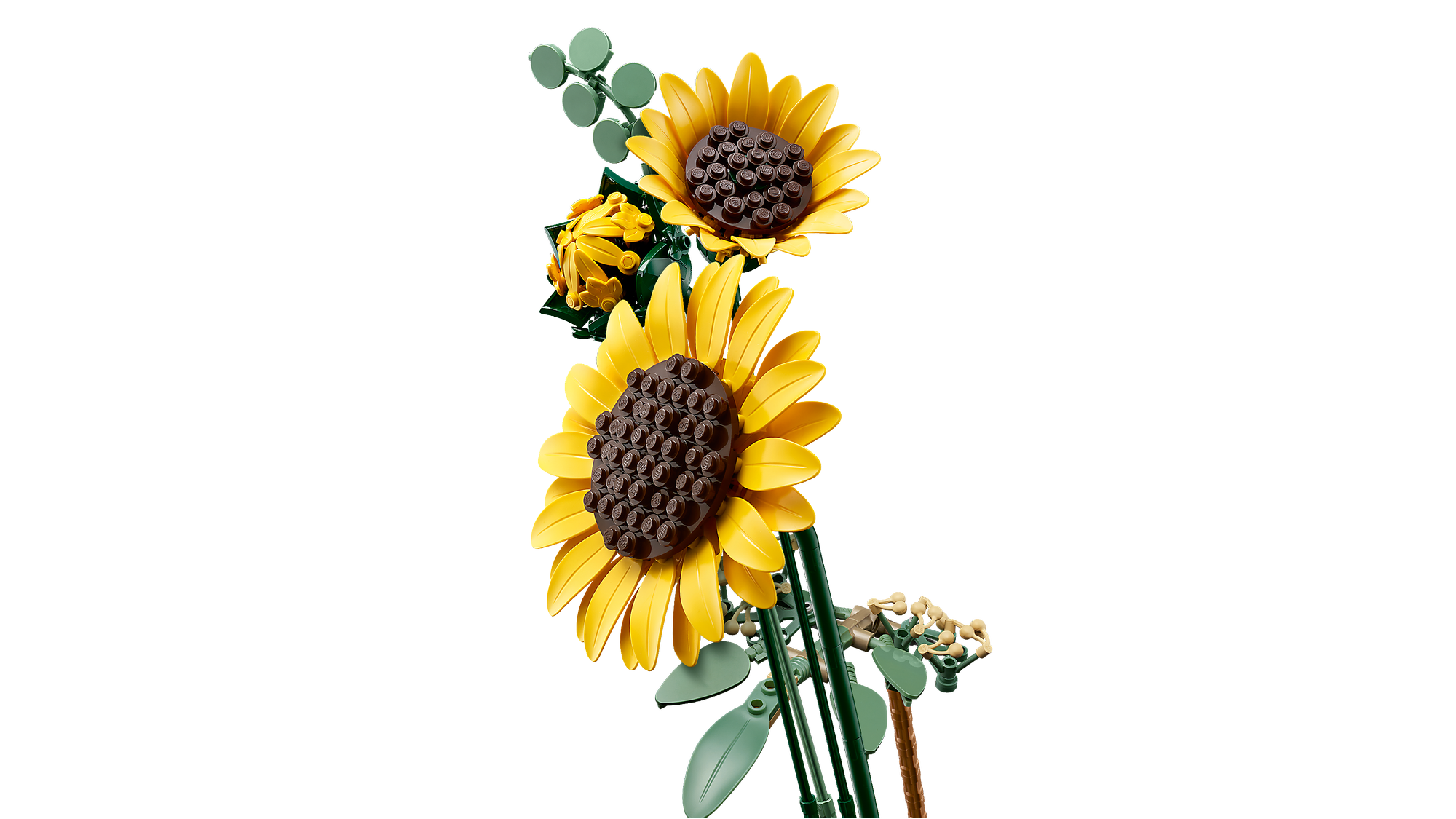 LEGO® Solsikker – Buketten indeholder 6 solsikker i forskellige stadier: 1 solsikkeknop, 3 nyligt udsprungne og 2 store, åbne solsikker.