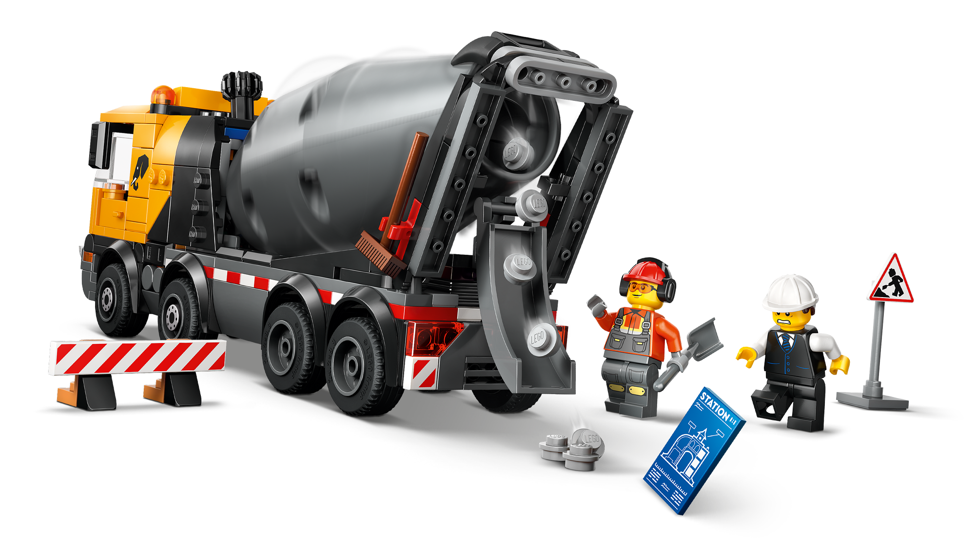 LEGO® Minifigurer-tilbehør– Legetøjssættet af en cementlastbil omfatter LEGO tilbehør, bl.a. trillebør, vejskilt, 2 barrierer, clipboard, spade og kost.