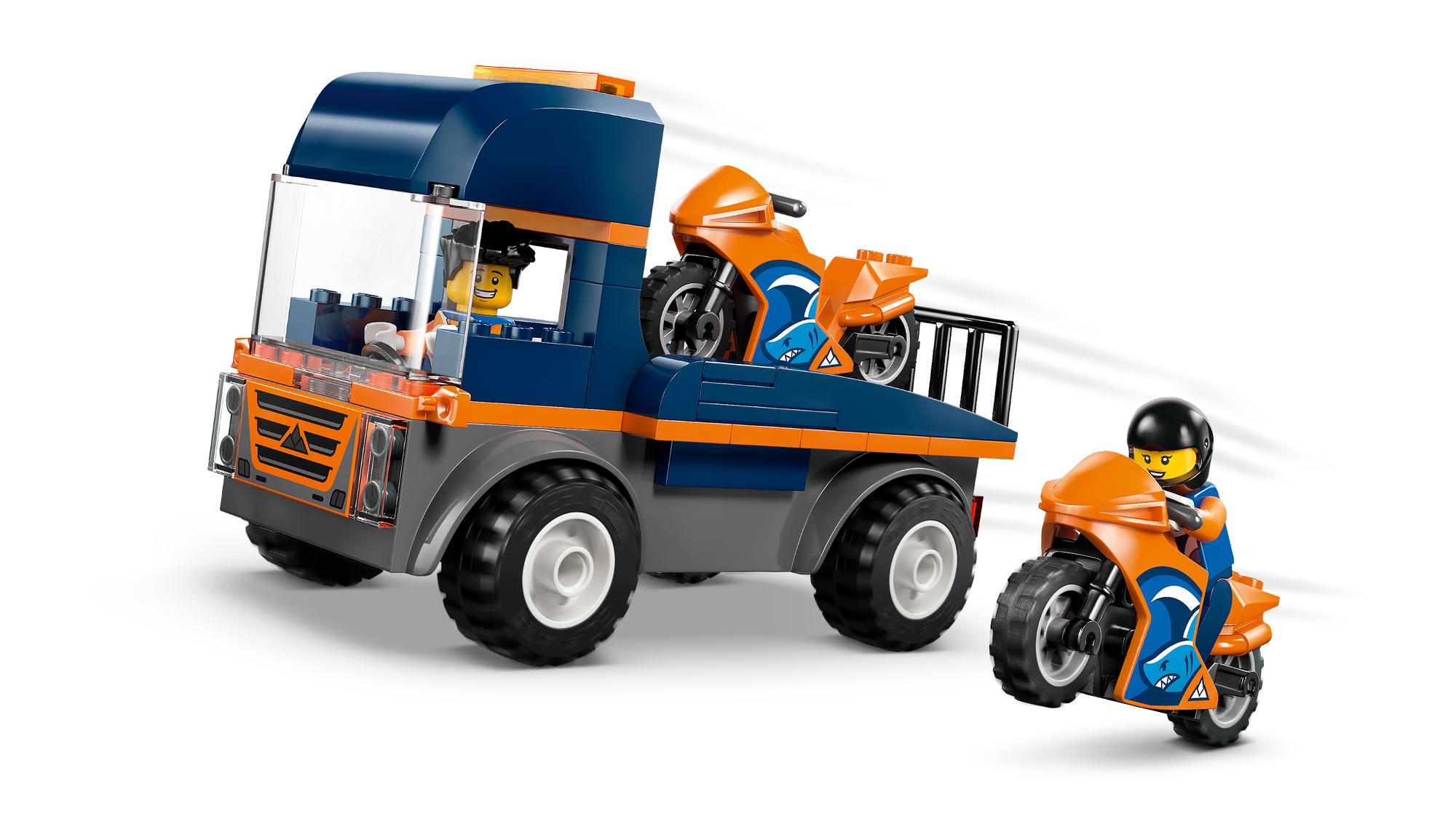 Legetøj til børns rolleleg – Børn kan sætte en minifigur i blokvognens førerhus og sætte rampen på for at læsse de 2 motorcykelmodeller af og på.