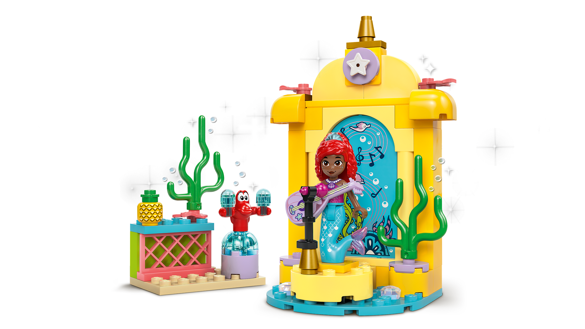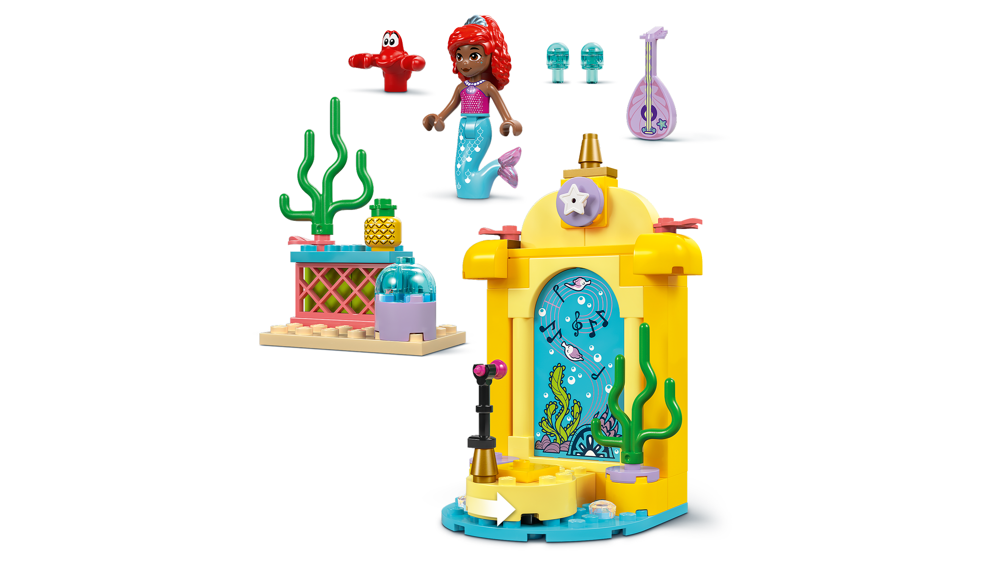Bygge- og legesæt – Byg-selv-sættet indeholder en musikscene, der er inspireret af tv-serien Ariel på Disney Junior, en LEGO® ǀ Disney minidukkefigur af Ariel og en LEGO ǀ Disney dyrefigur af Sebastian.