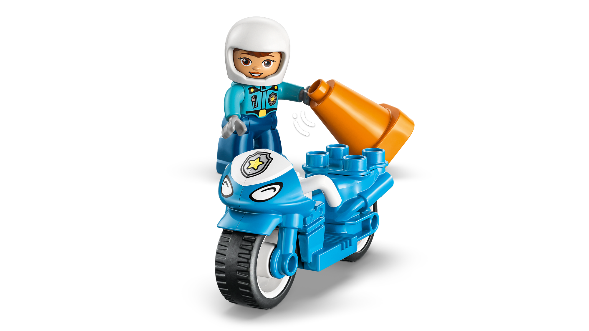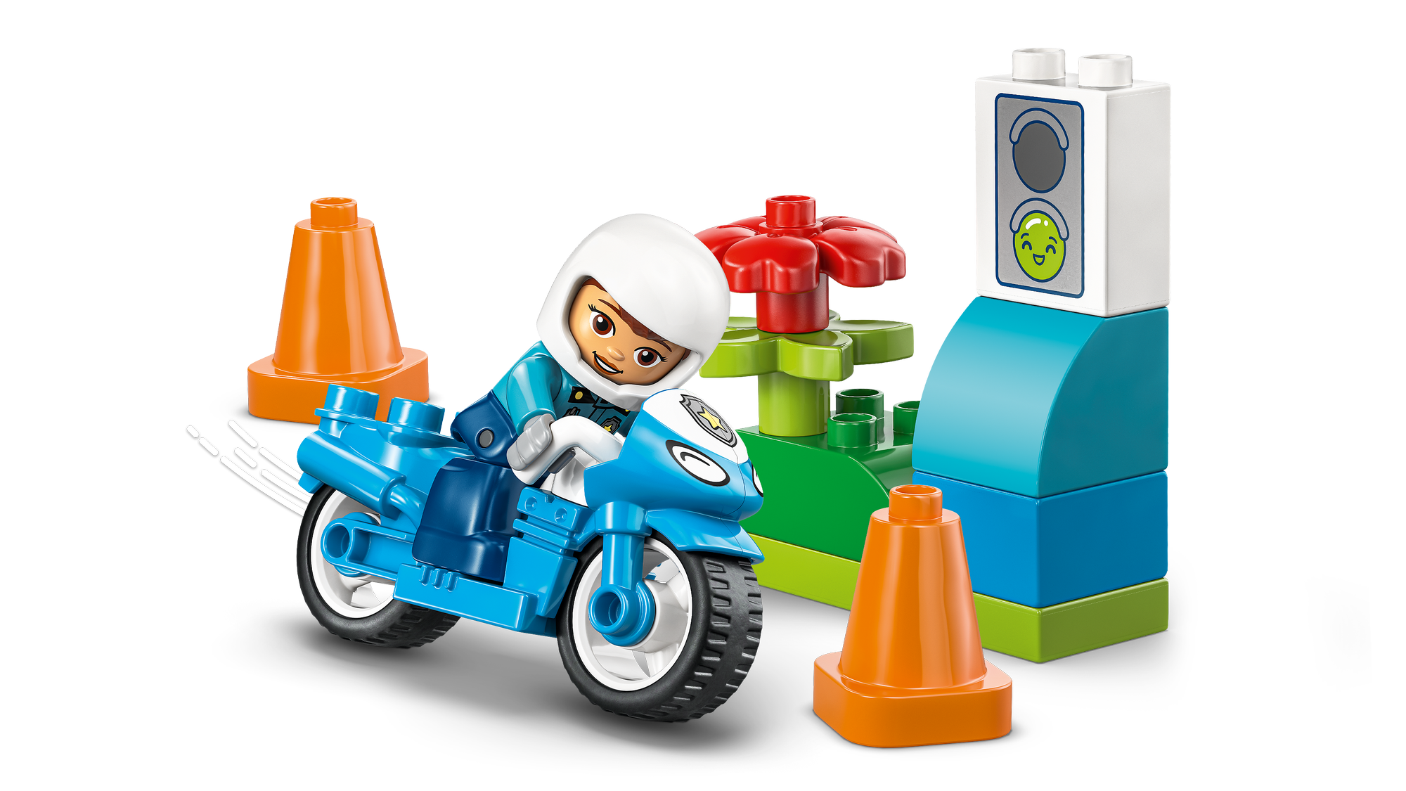 Politilegetøj til kreativ leg – Tumlinger kan skabe sjove historier om at hjælpe trafikanter i nabolaget og samtidig træne finmotorikken ved at sætte politibetjenten på hendes LEGO® DUPLO® motorcykel og køre rundt om keglerne.