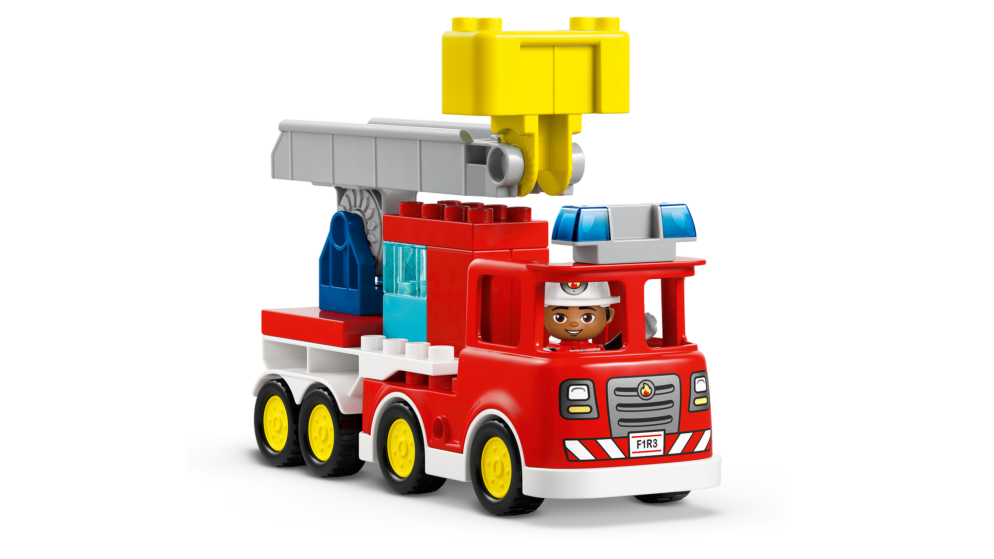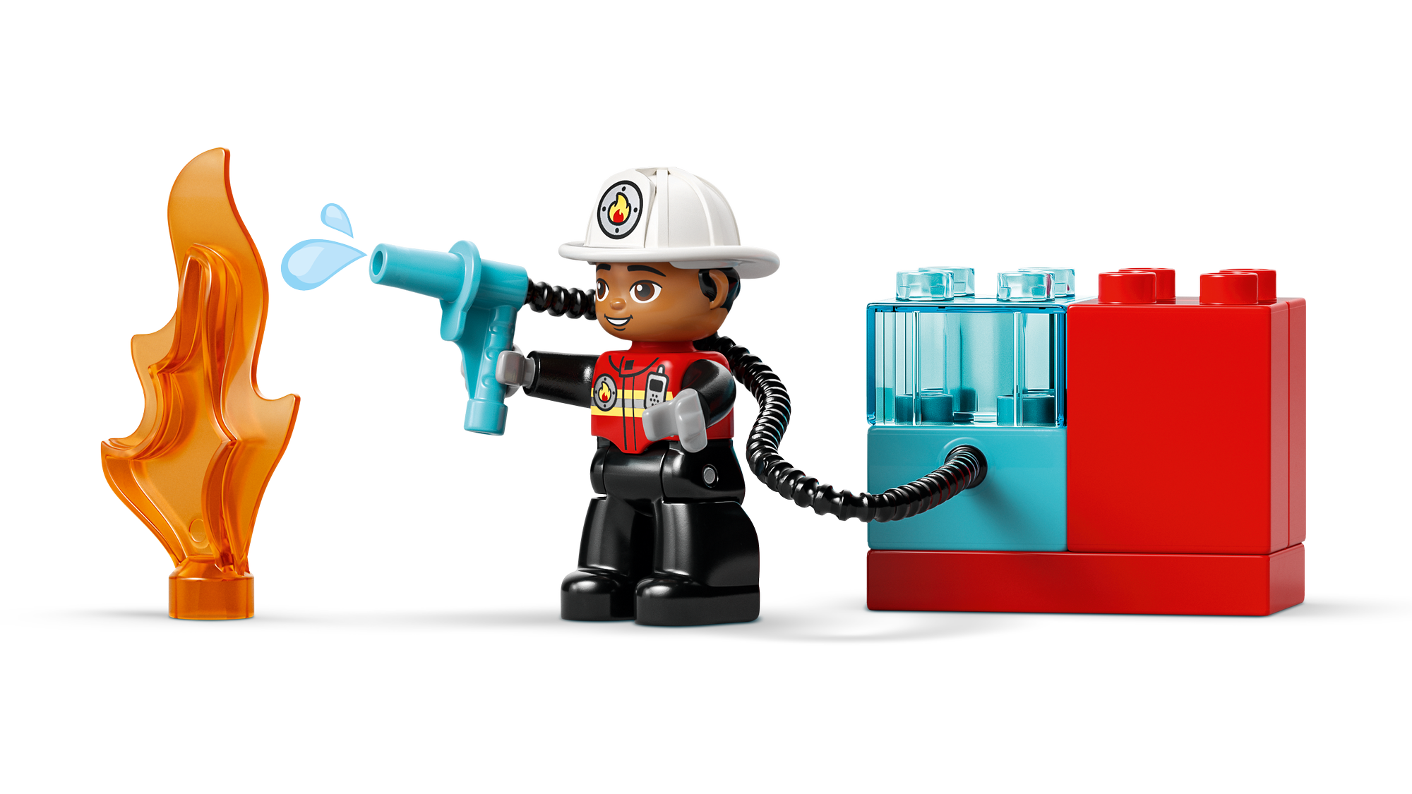 LEGO® DUPLO® Legetøjsbrandmand – Legesættet er perfekt til rolleleg, hvor de mindste kan forestille sig, at de er brandfolk, og bruge en stige og en slange til at slukke en brand i en træstamme, mens et egern ser på.