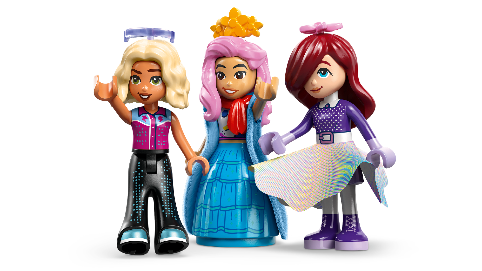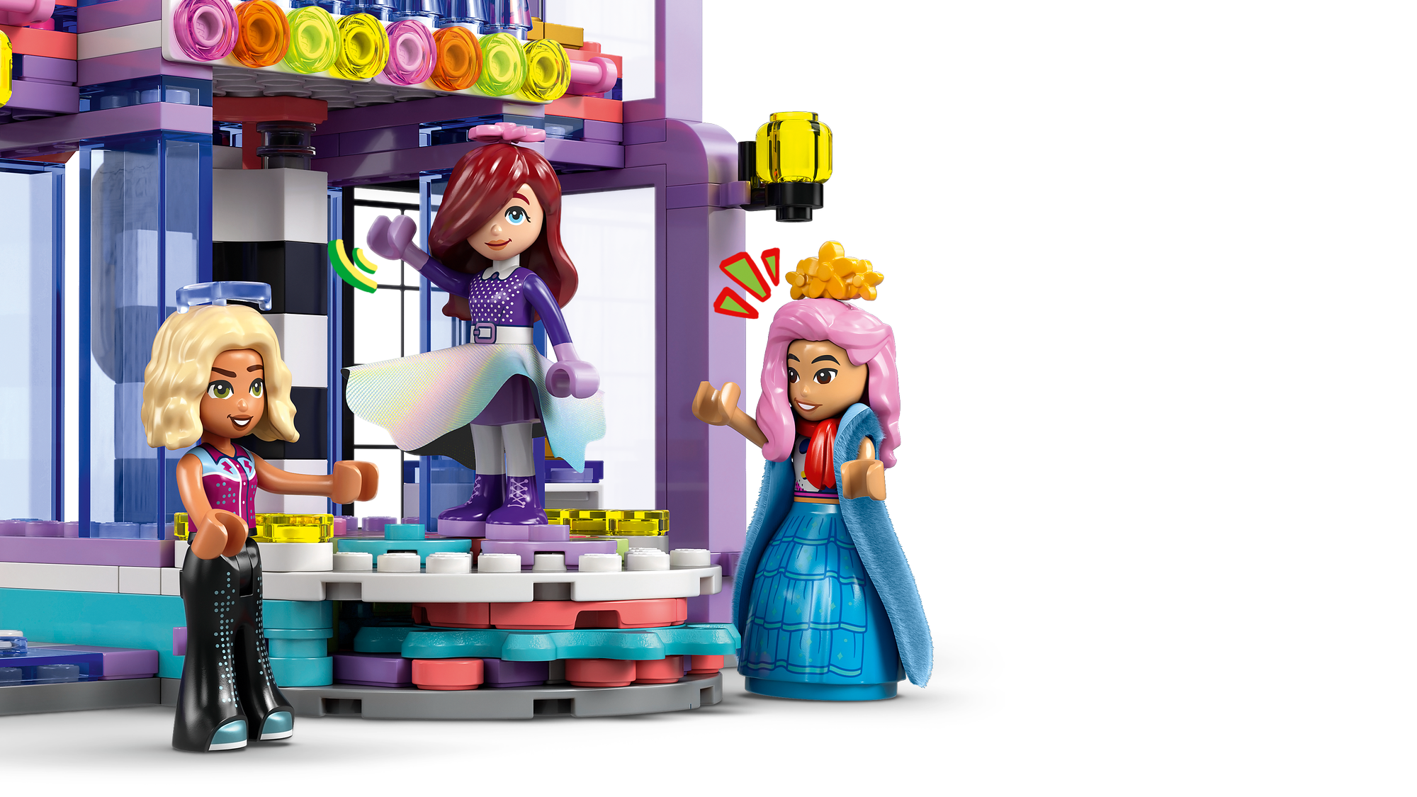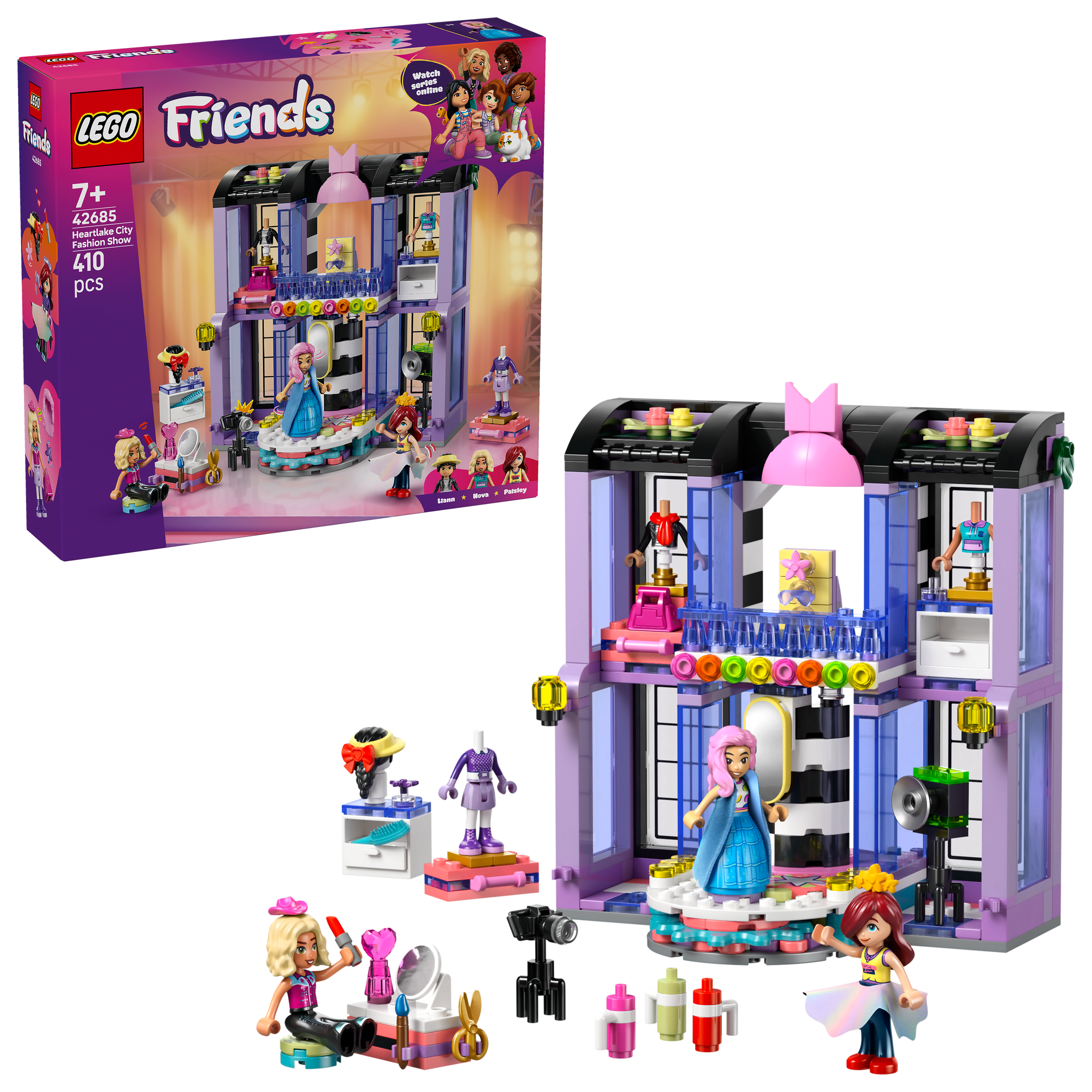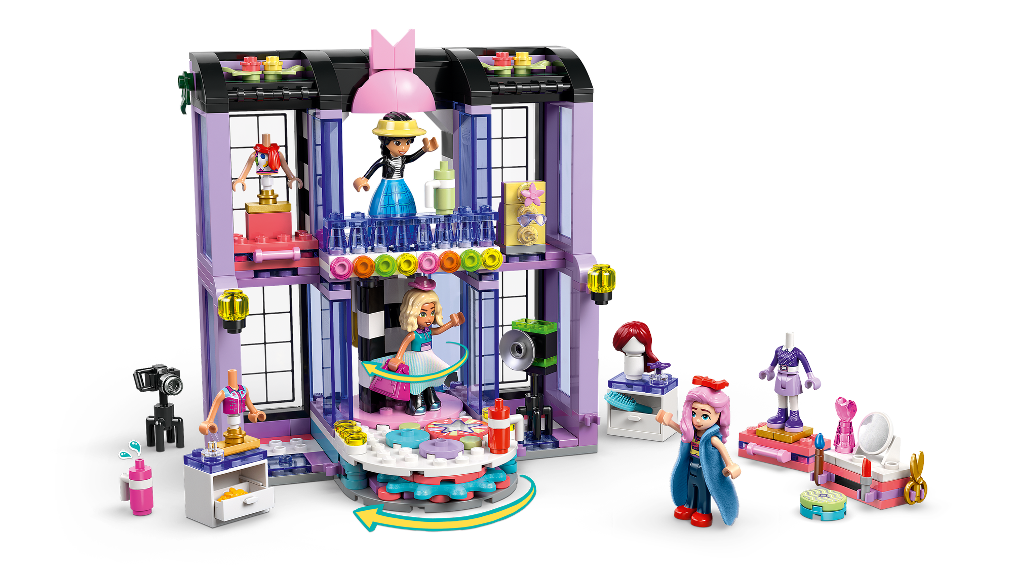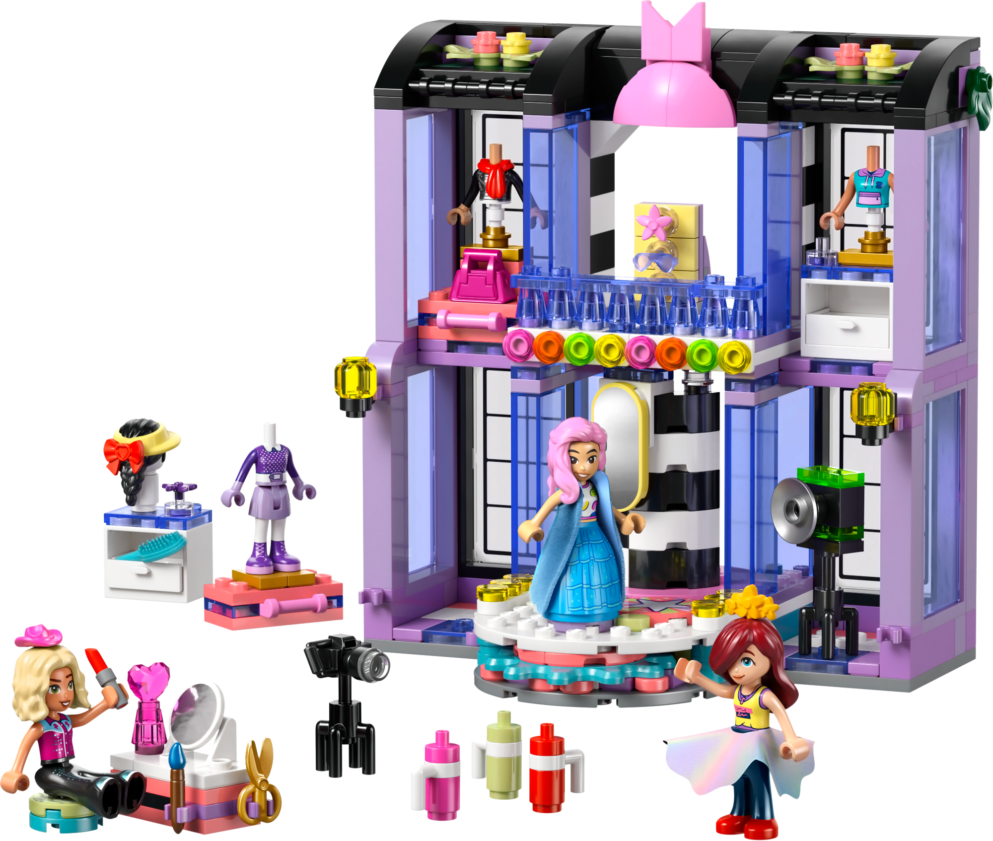 3 LEGO® Friends karakterer – Mode- og påklædningslegetøjet omfatter 3 minidukker – Paisley, Liann og Nova – der kan styles ved sminkebordet og stilles på den roterende platform for at præsentere outfittet.