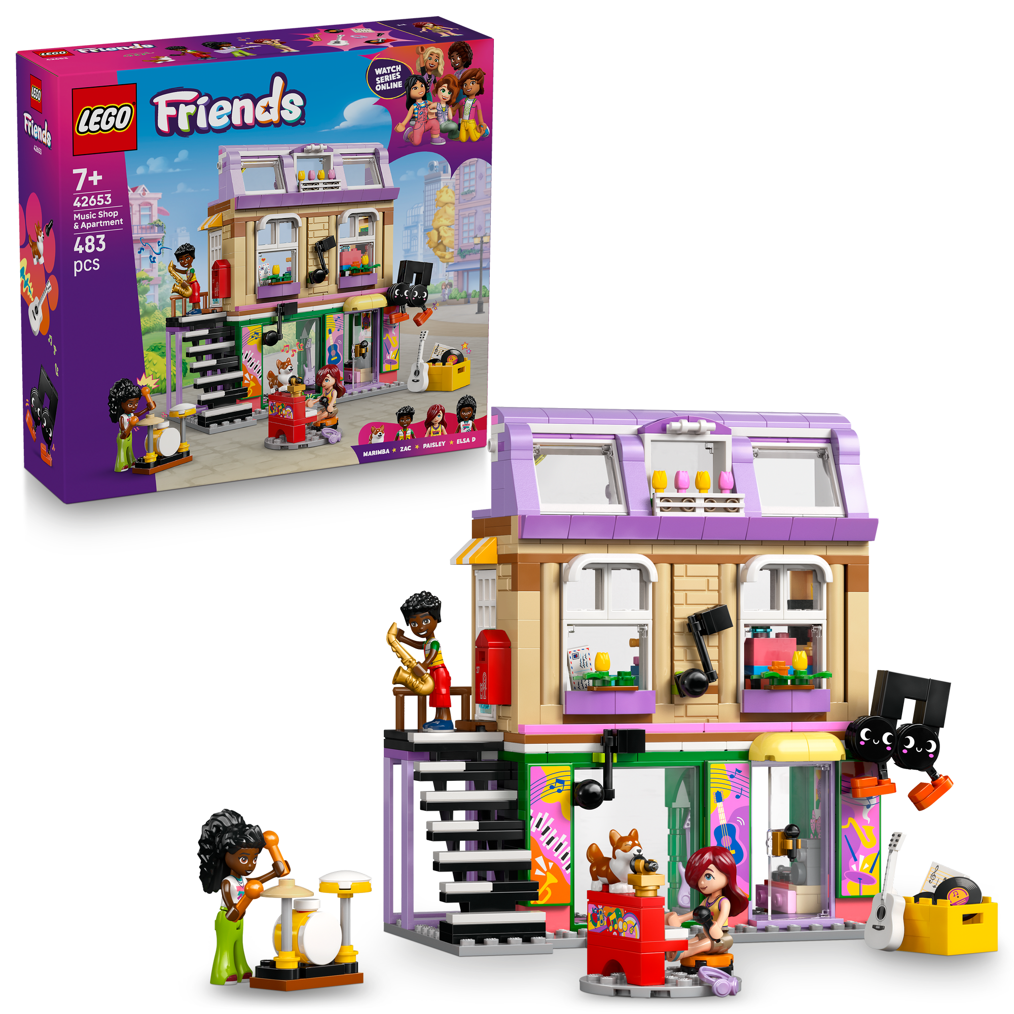 3 LEGO® Friends karakterer og corgi-figur – Sættet har masser af personlighed og indeholder minidukker af Paisley, Zac og Elsa D, en corgi-figur, node-maskot, trappe udformet som klavertangenter og meget mere.