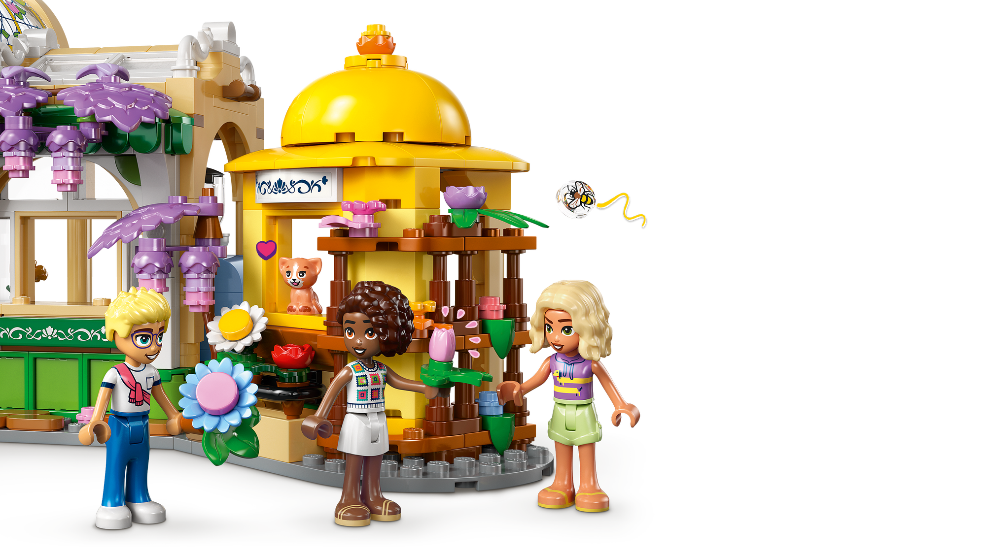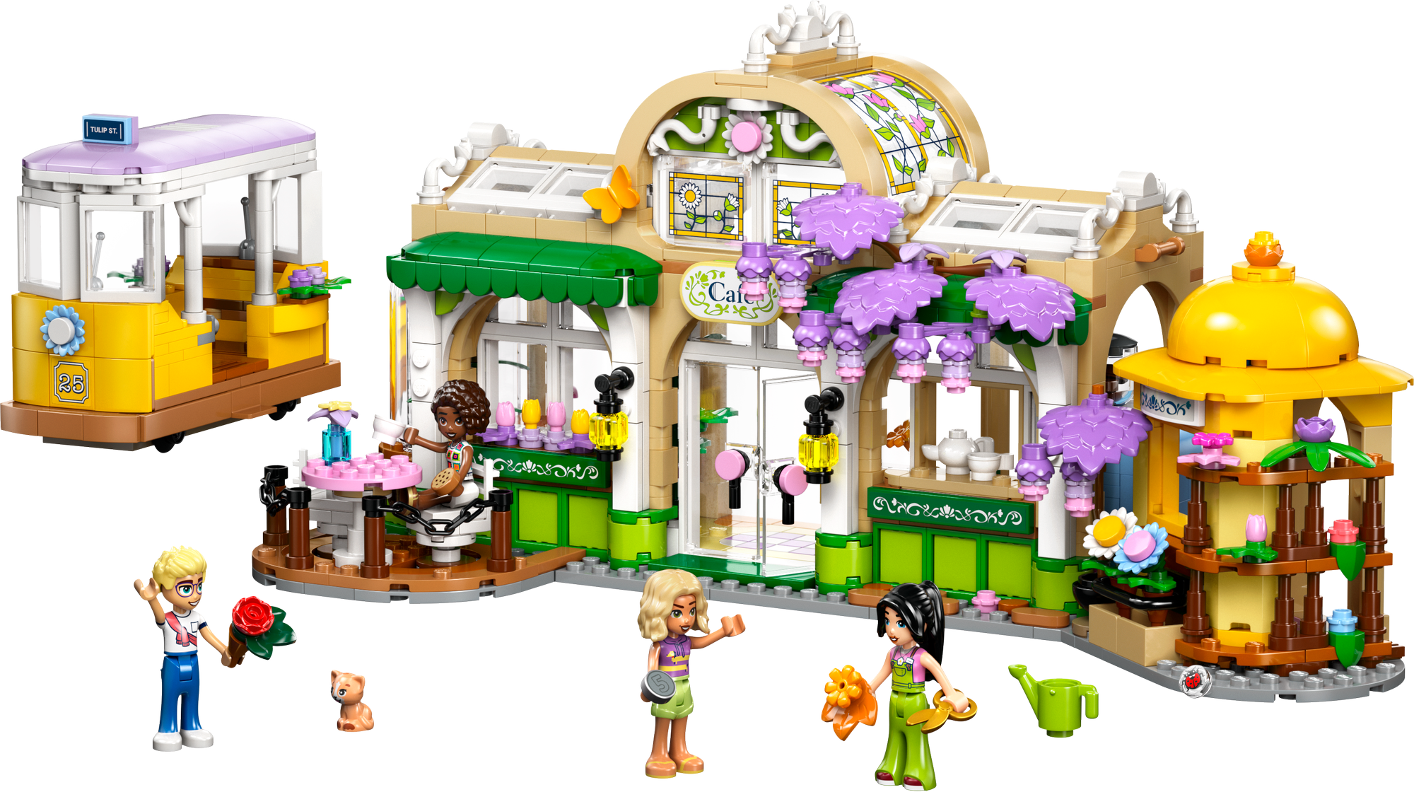 4 LEGO® Friends karakterer – Legesættet med blomster- og cafétema indeholder minidukker af Aliya, Esma, Olly og Nova samt en figur af katten Nugget og masser af madtilbehør plus plante- og blomsterelementer til sjov leg.