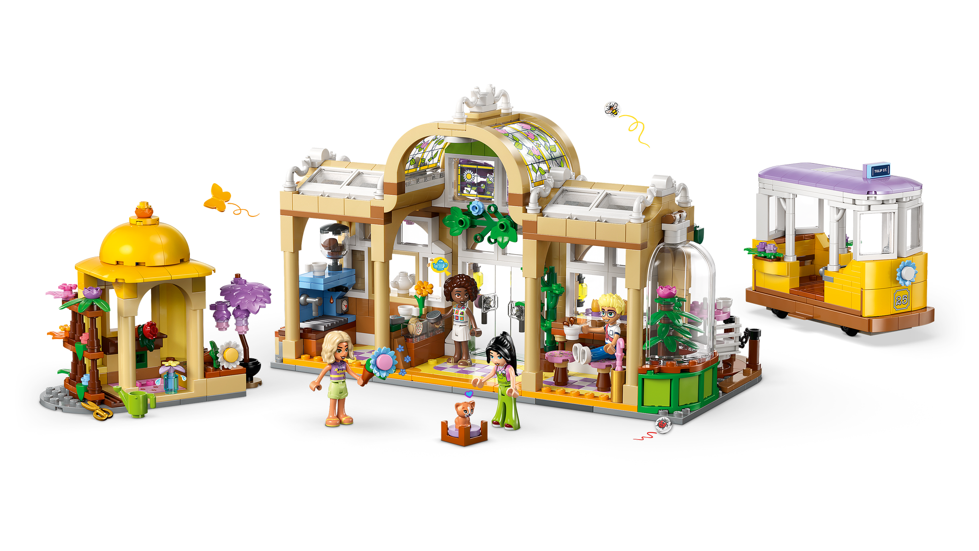 Et byggesæt, der blomstrer af venskab – Lad børns fantasi vokse og gro med LEGO® Friends legesættet Plantecafé og blomsterbutik til piger og drenge, som indeholder et scenarie med en blomsterbutik og café samt en legetøjssporvogn.