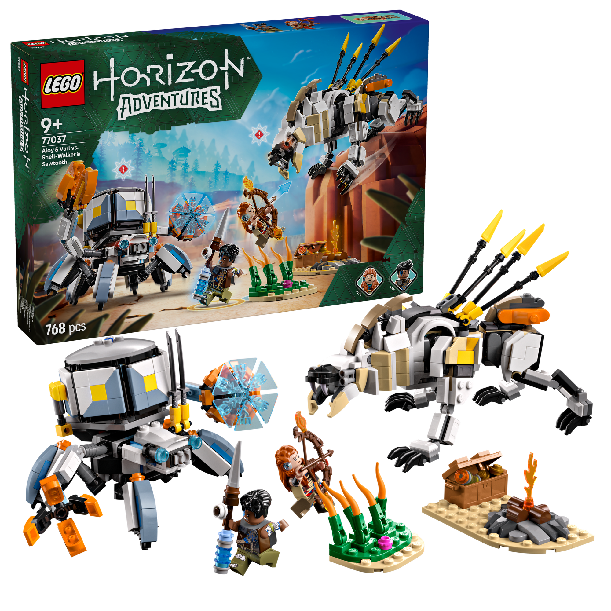 LEGO® sæt med Horizon-spiltema til børn – Byggesættet Aloy og Varl mod skjoldgænger og savtand er spækket med fysisk sjov for drenge og piger fra 9 år, som er vilde med videospillet LEGO® Horizon Adventures™.