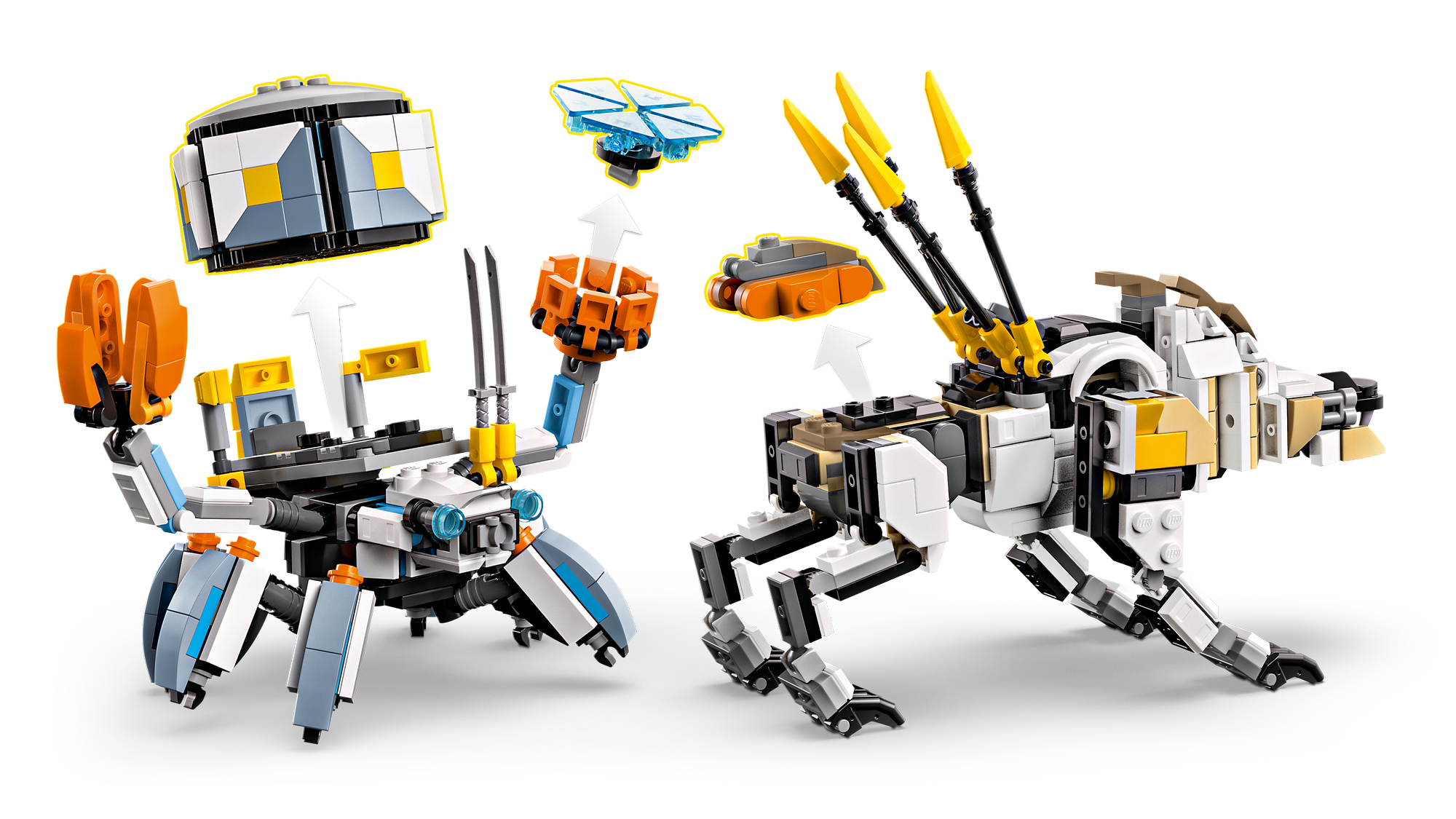 Legetøjssæt med Horizon-robotvæsner – Skjoldgængeren har skjold, energikapsel, bevægelige ben og arme og kløer, der kan åbnes, mens savtanden har kæber, der kan åbnes, en drejelig overkrop og bevægelig hals, hoved og ben.
