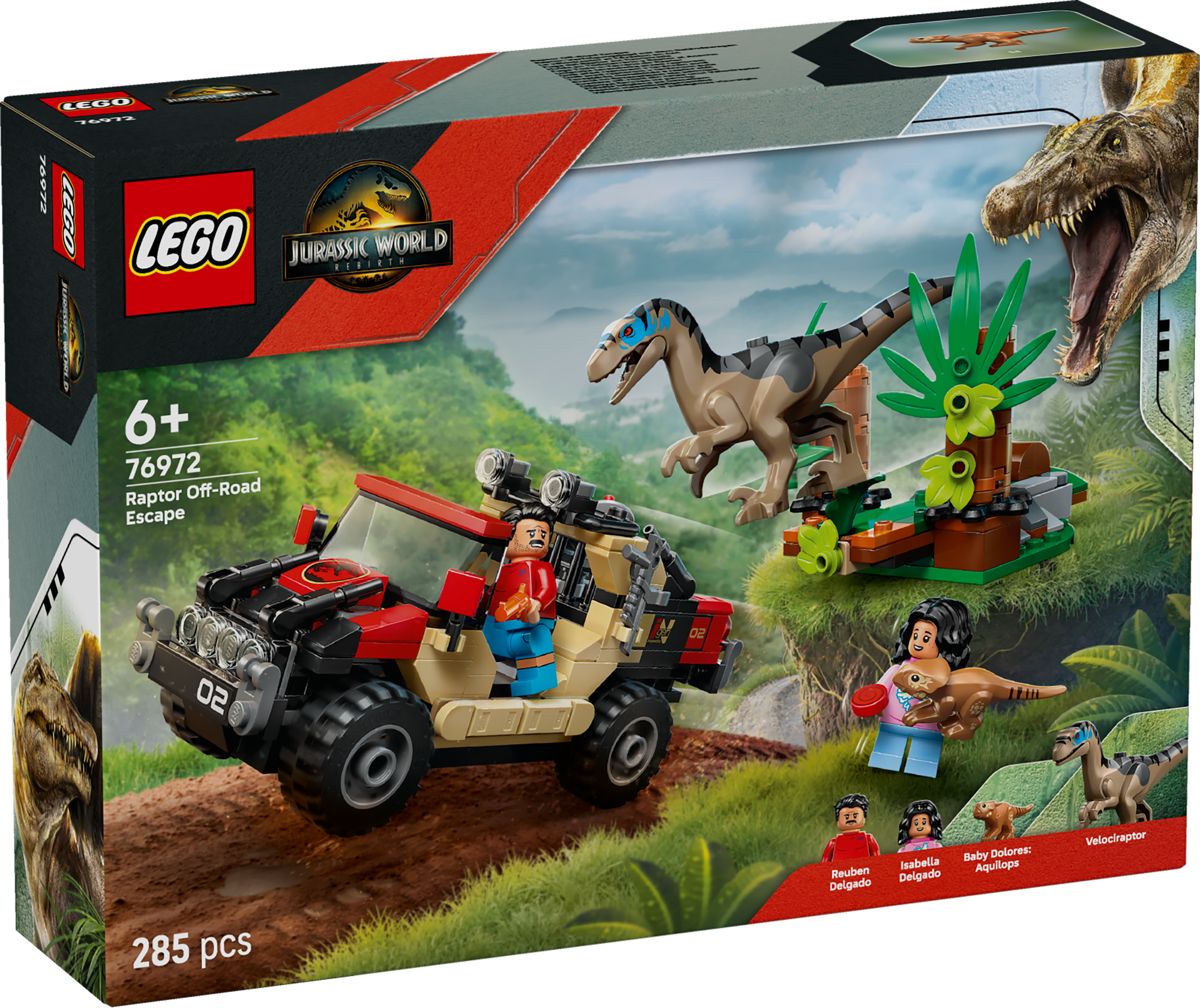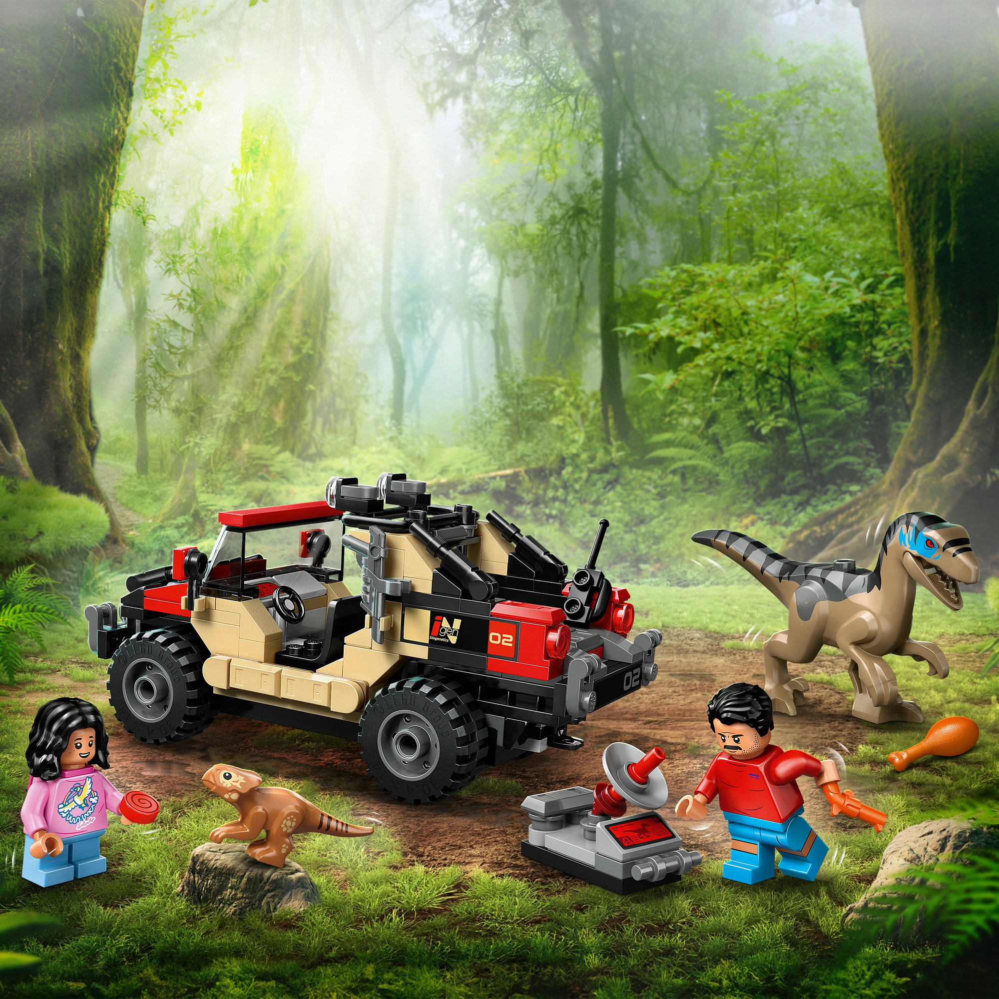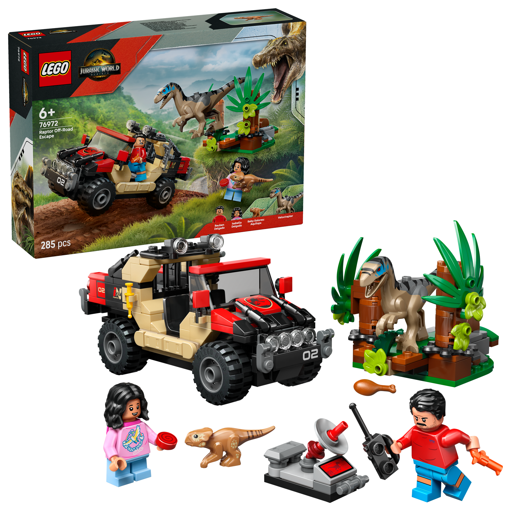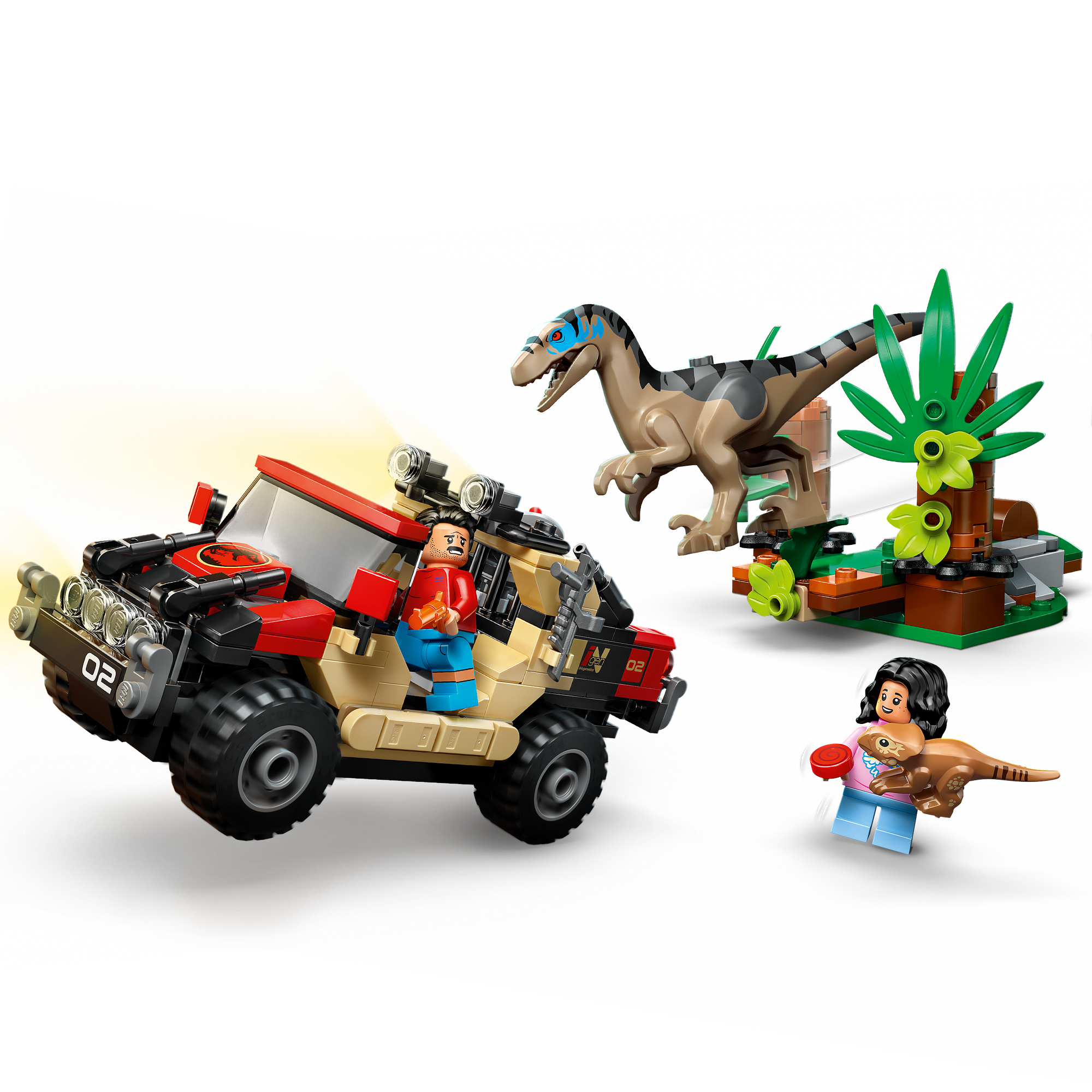 Kreativt byggesæt – Indeholder støbte LEGO® dinosaurfigurer af en aquilops-unge og en velociraptor samt et offroad-køretøj og minifigurer af Reuben og Isabella, der kan sætte gang i leg med vild dinosaurjagt.