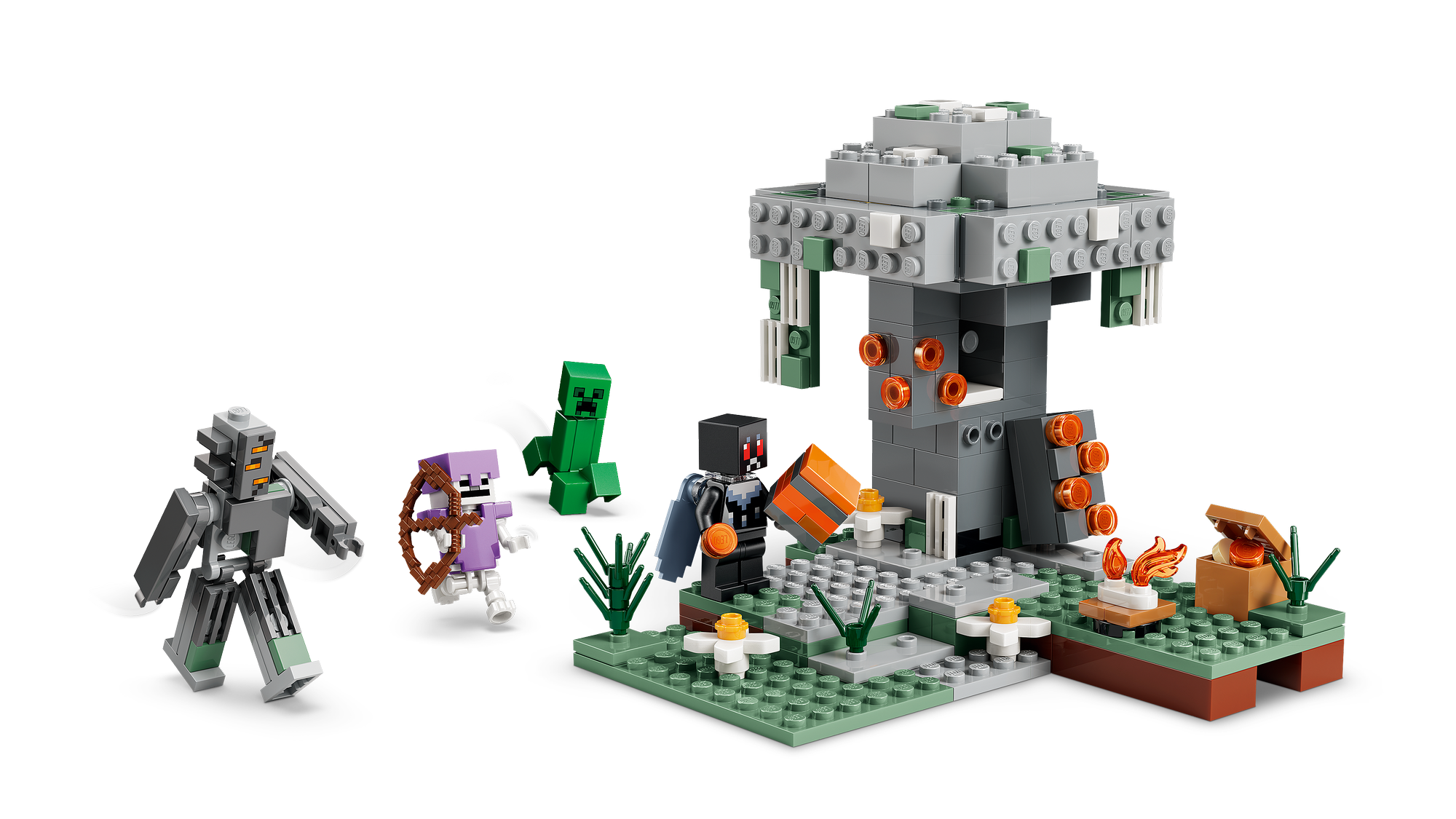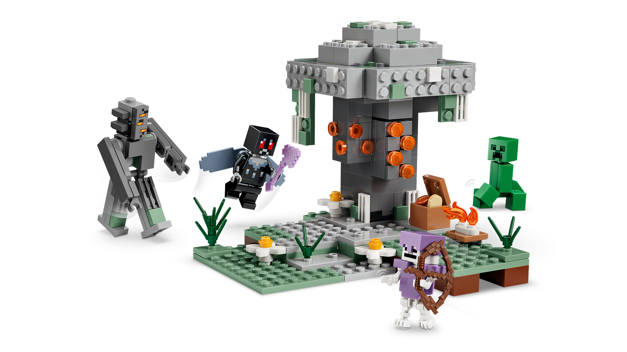 4 Lego® Minecraft®-Karakterer – En klodsbygget knirker kæmper mod den heroiske, bevingede Mothman, mens en Creeper™ og et skelet lusker rundt i biomet Den Blege Have.