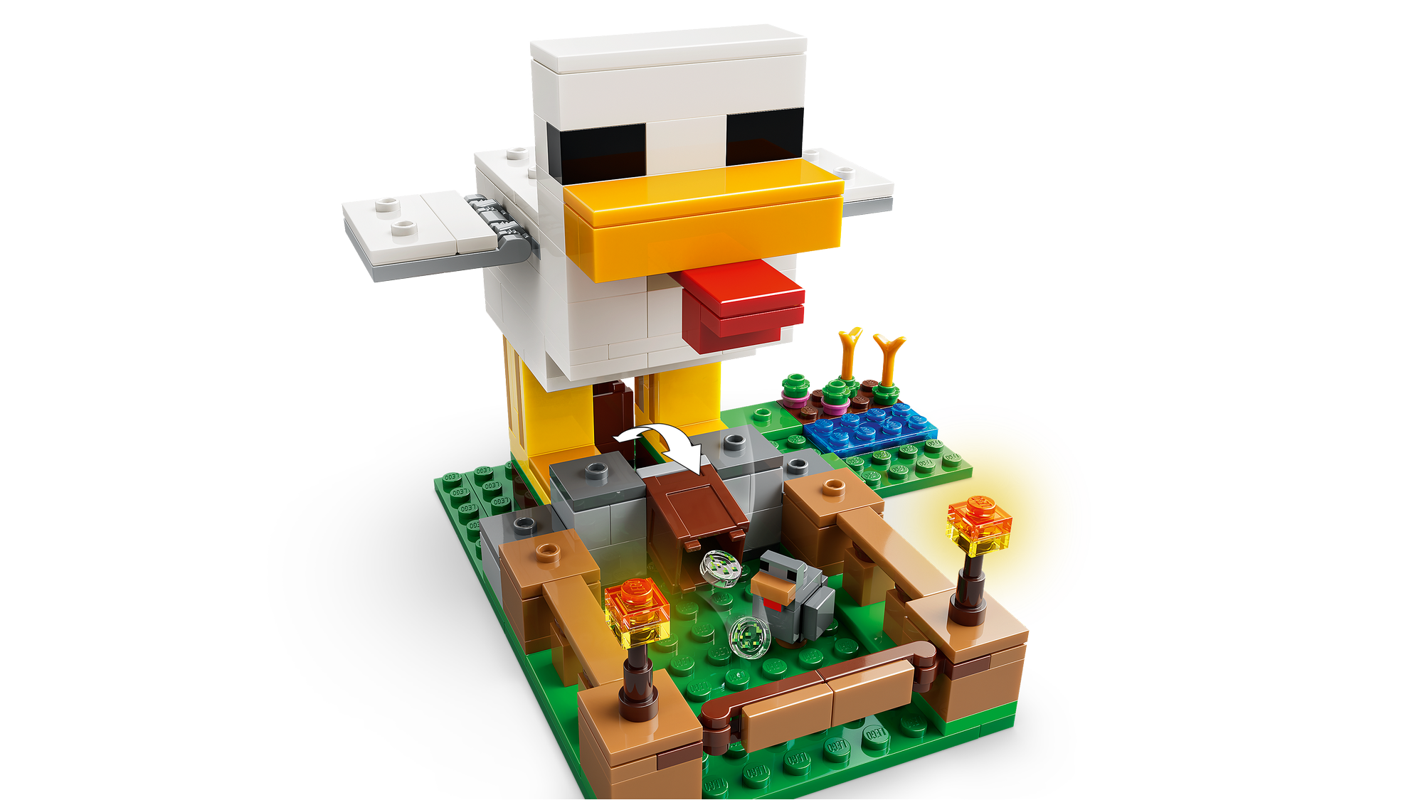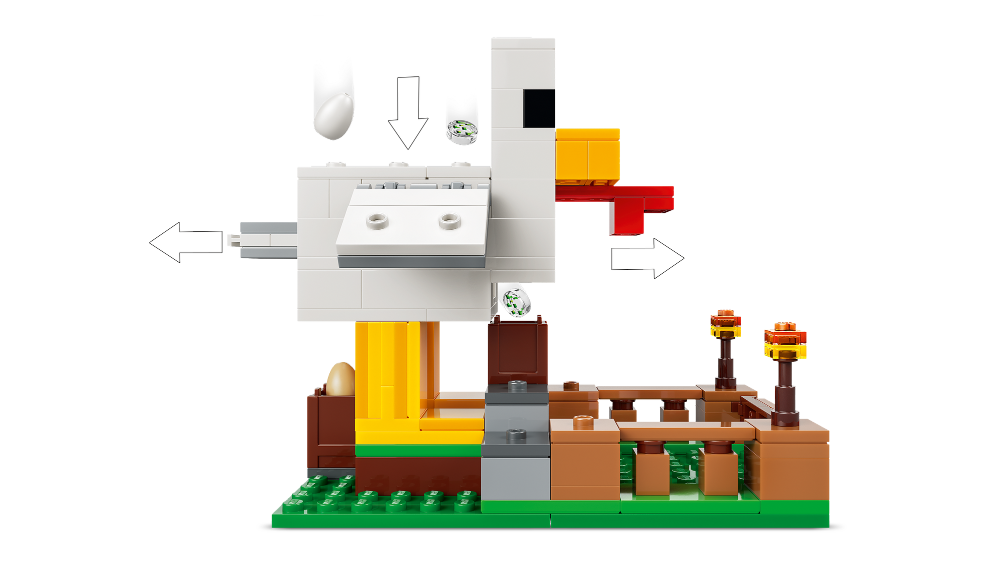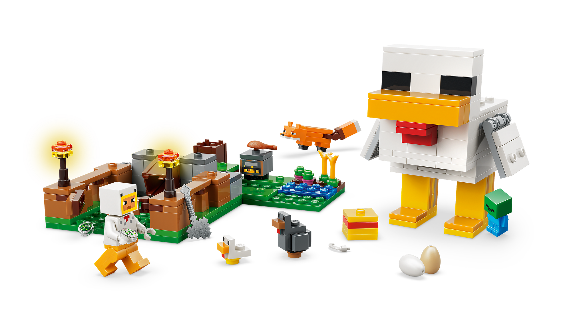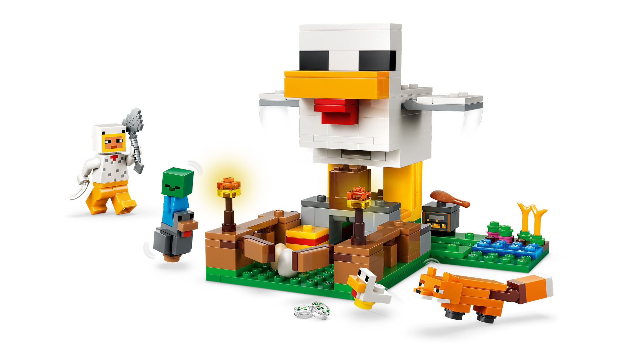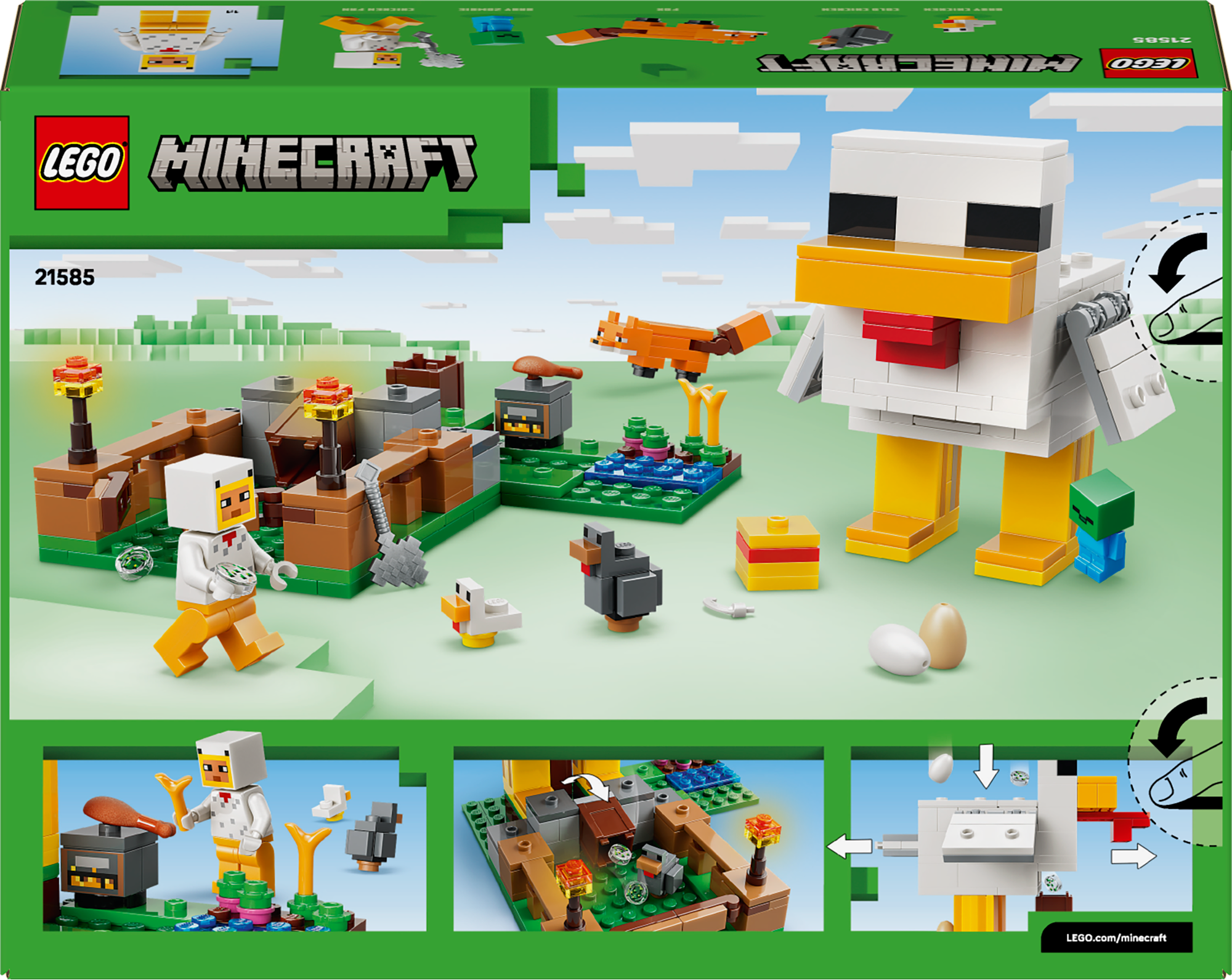 Gaming-inspireret legesæt – Nyd rolleleg med at passe høns ved hjælp af de sjove funktioner i hønsehuset, og afværg en zombieunge, der prøver at få et lift på en kylling, i dette LEGO® Minecraft® byggesæt.