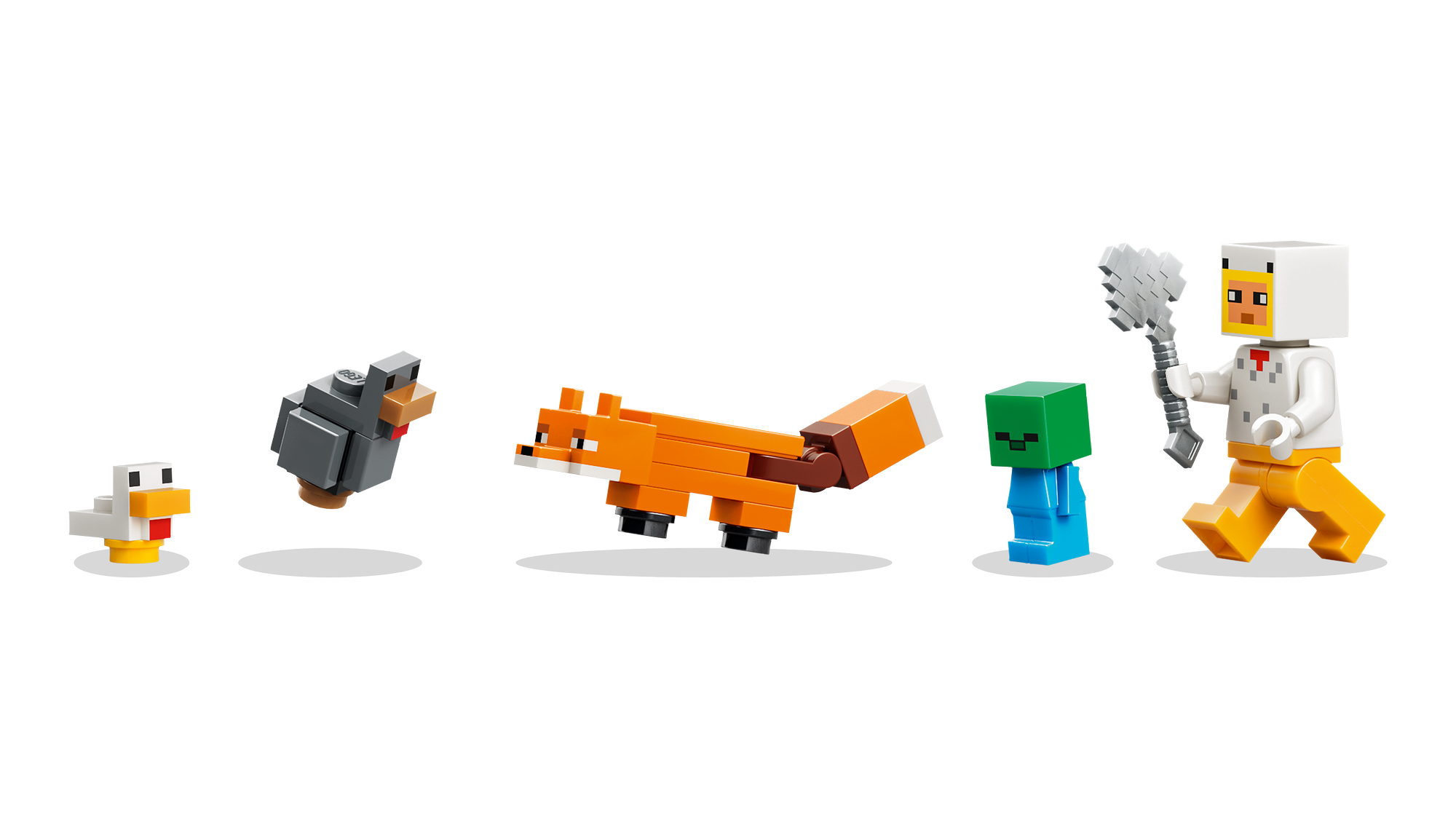Karakterer fra Minecraft®-Farm – LEGO® Minecraft sættet Hønsefarm (21585) indeholder en minifigur af en hønsefan samt en zombieunge (der kan lide at ride på kyllingen), en ræv, en kold høne og en kylling.