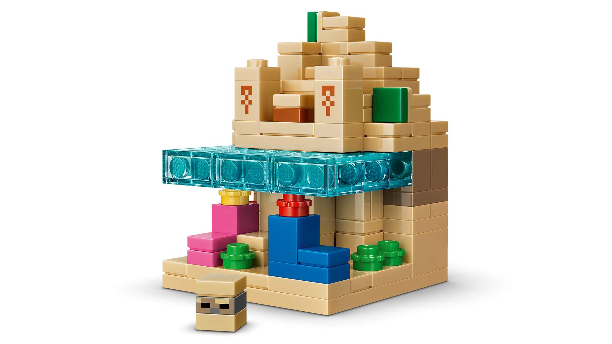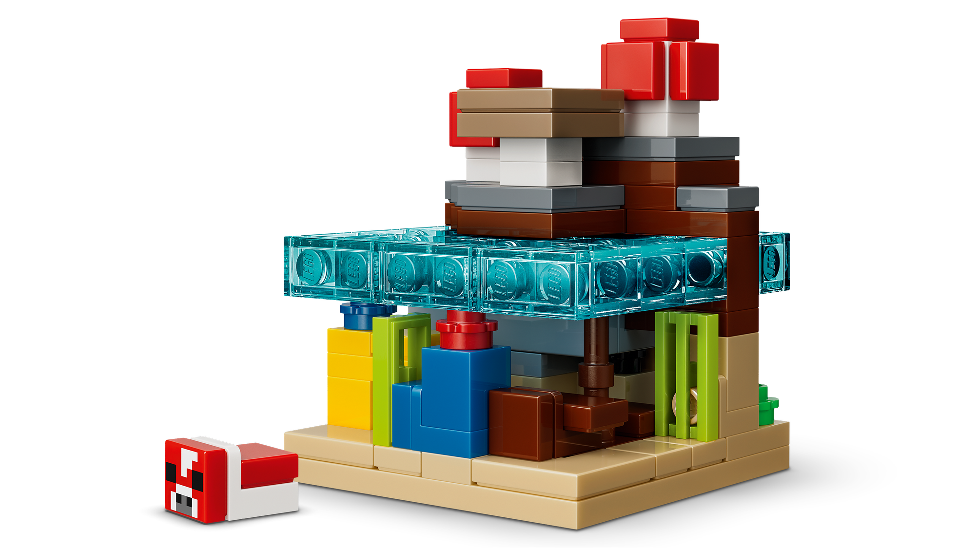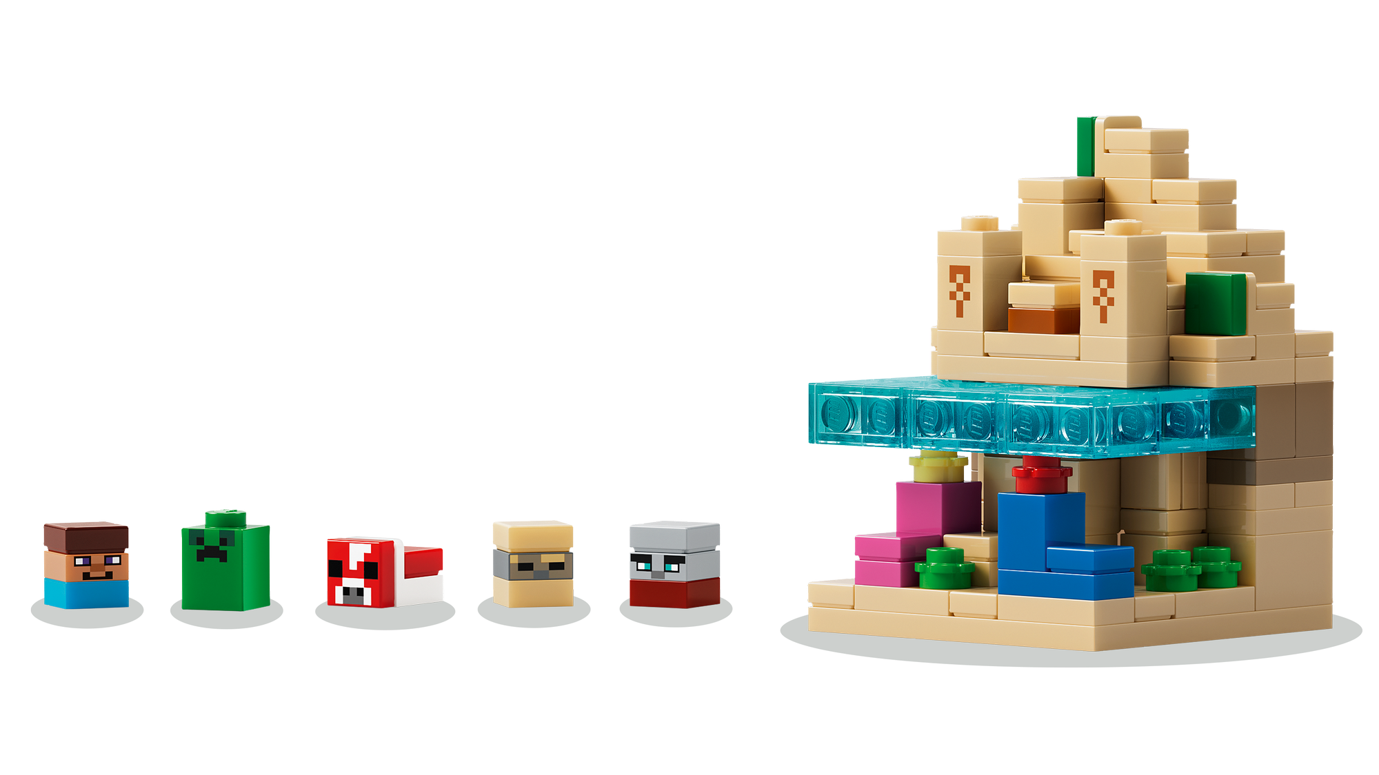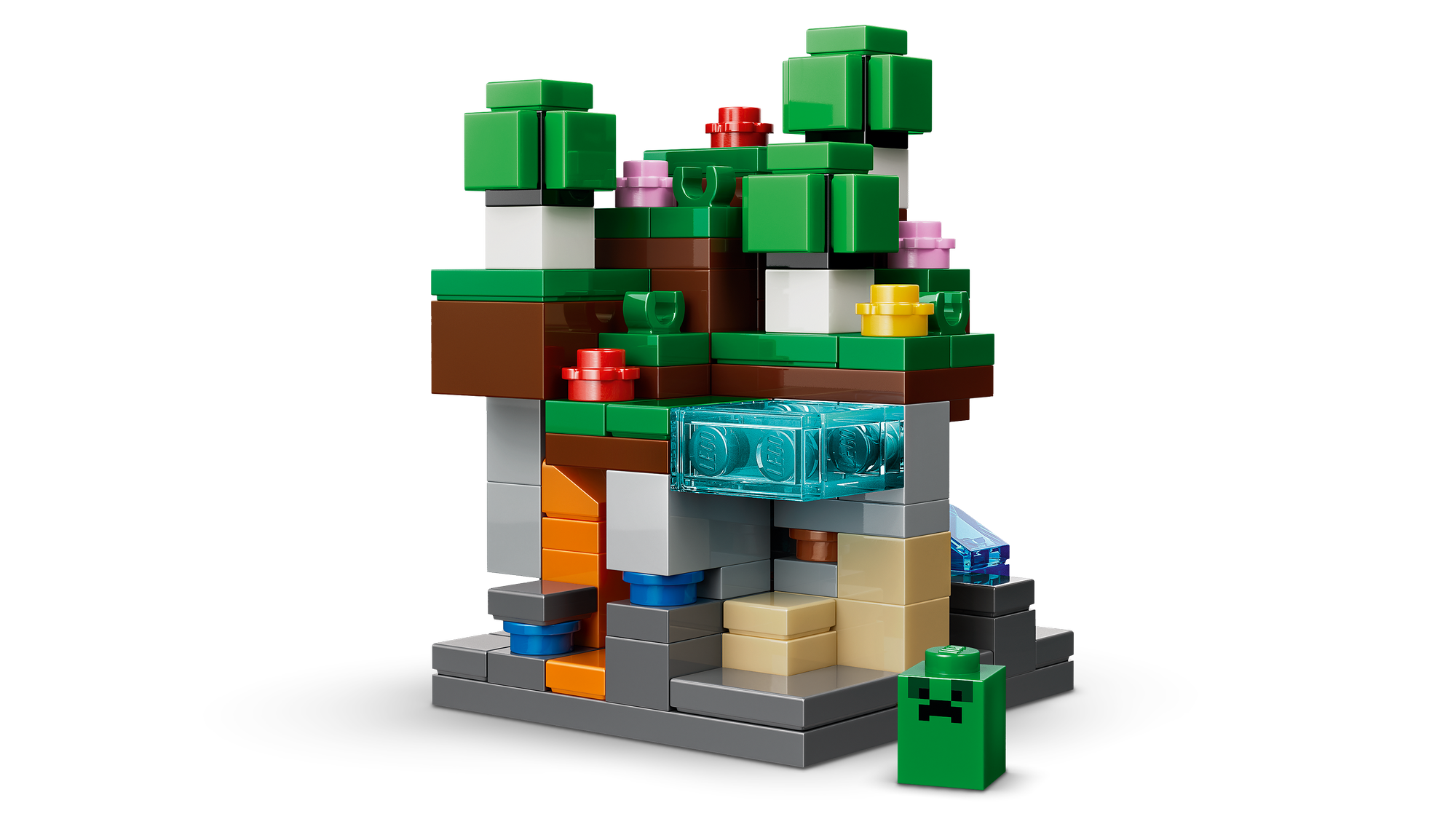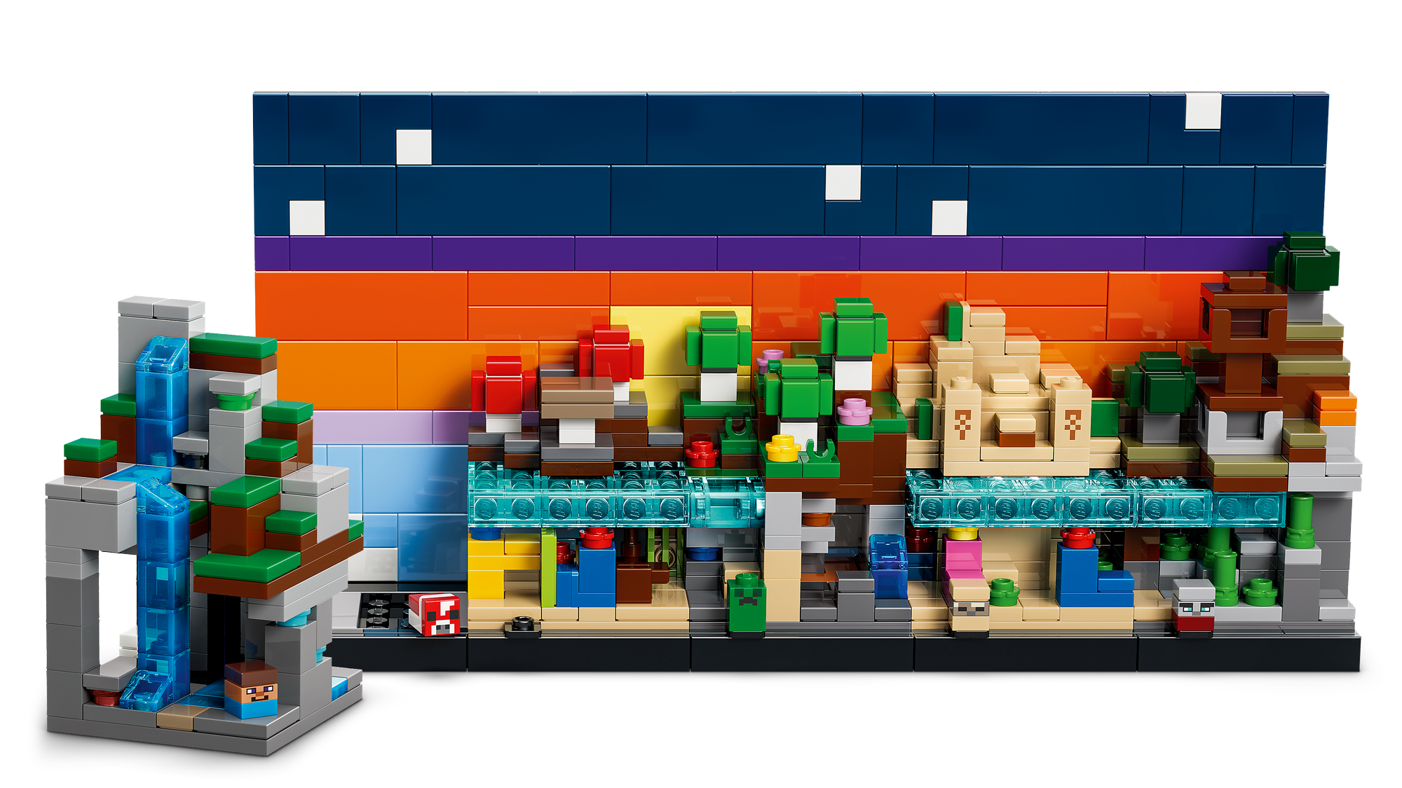 Legetøj med 5 Biomer og Minecraft®-Figurer – LEGO® sættet indeholder bjerg-, blomsterskov-, svampe-, ørken- og savannebiomer samt mikrofigurer af Steve, Creeper™, mooshroom, skal og røver.