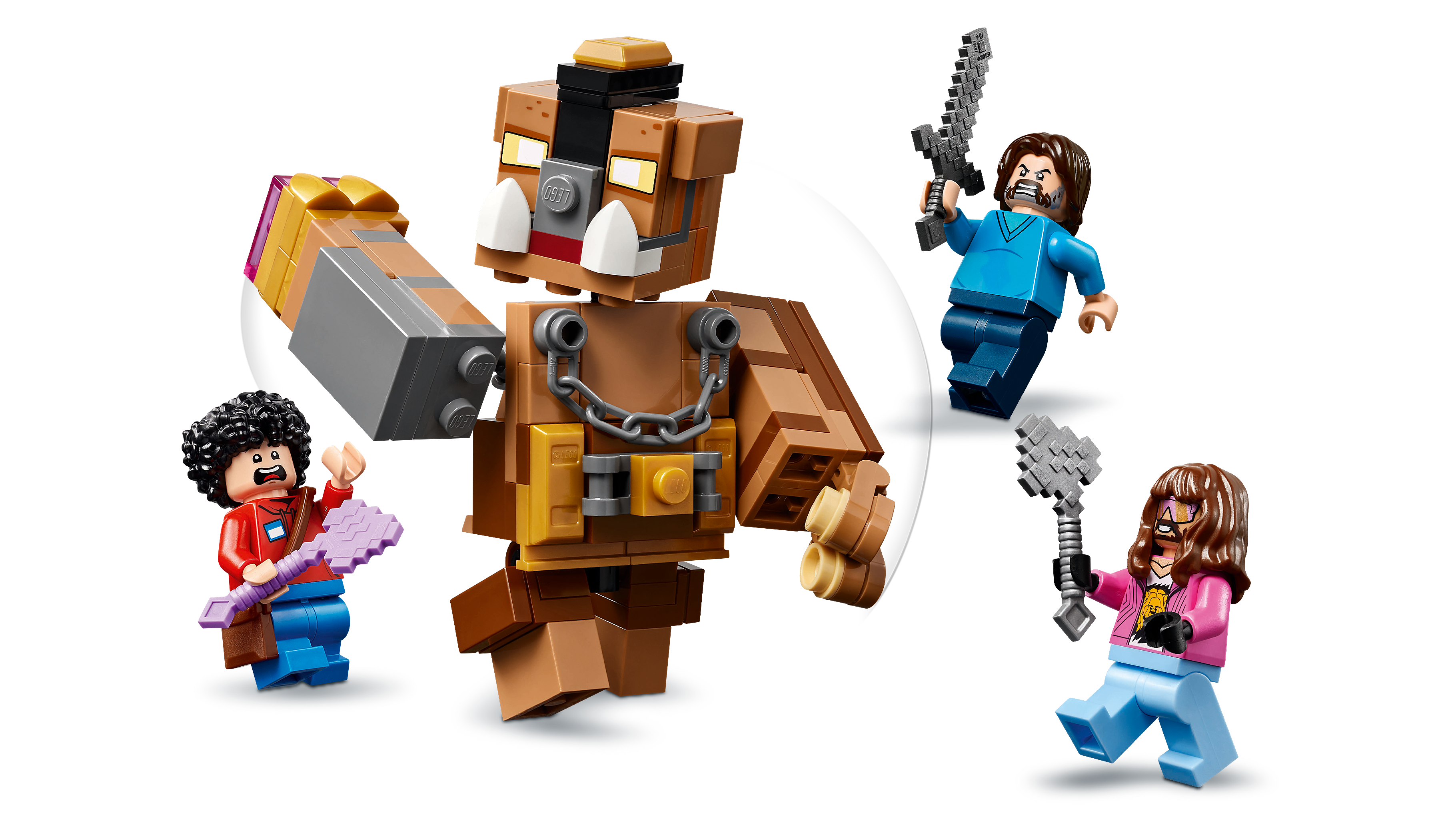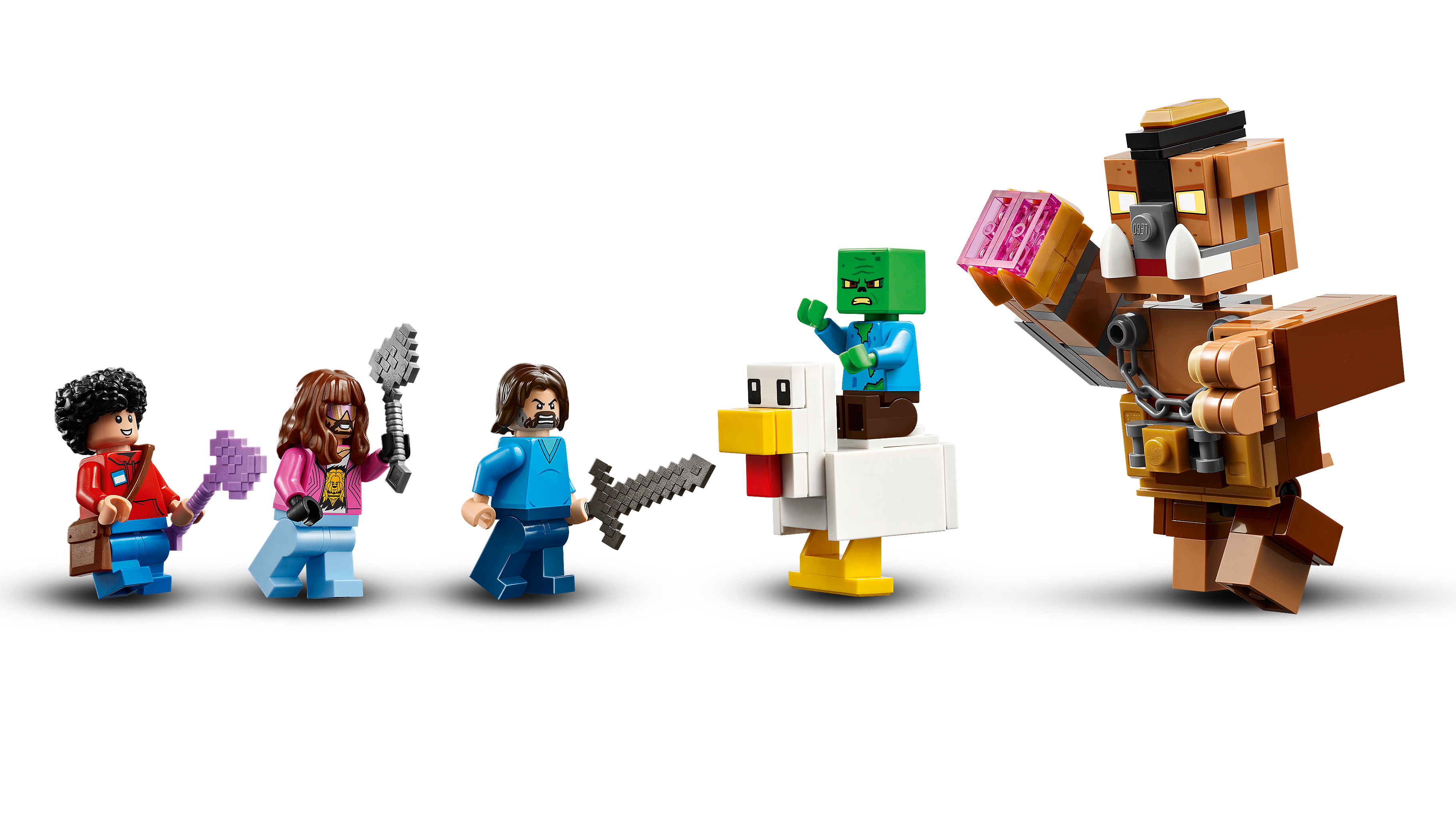 Minecraft®-legetøjsfigurer – Dette fysiske videospil-inspirerede byggesæt indeholder figurer fra filmen: Steve, Garrett, Henry, en zombieunge, en hønsejockey og en bevægelig figur af Scrofa den Store.