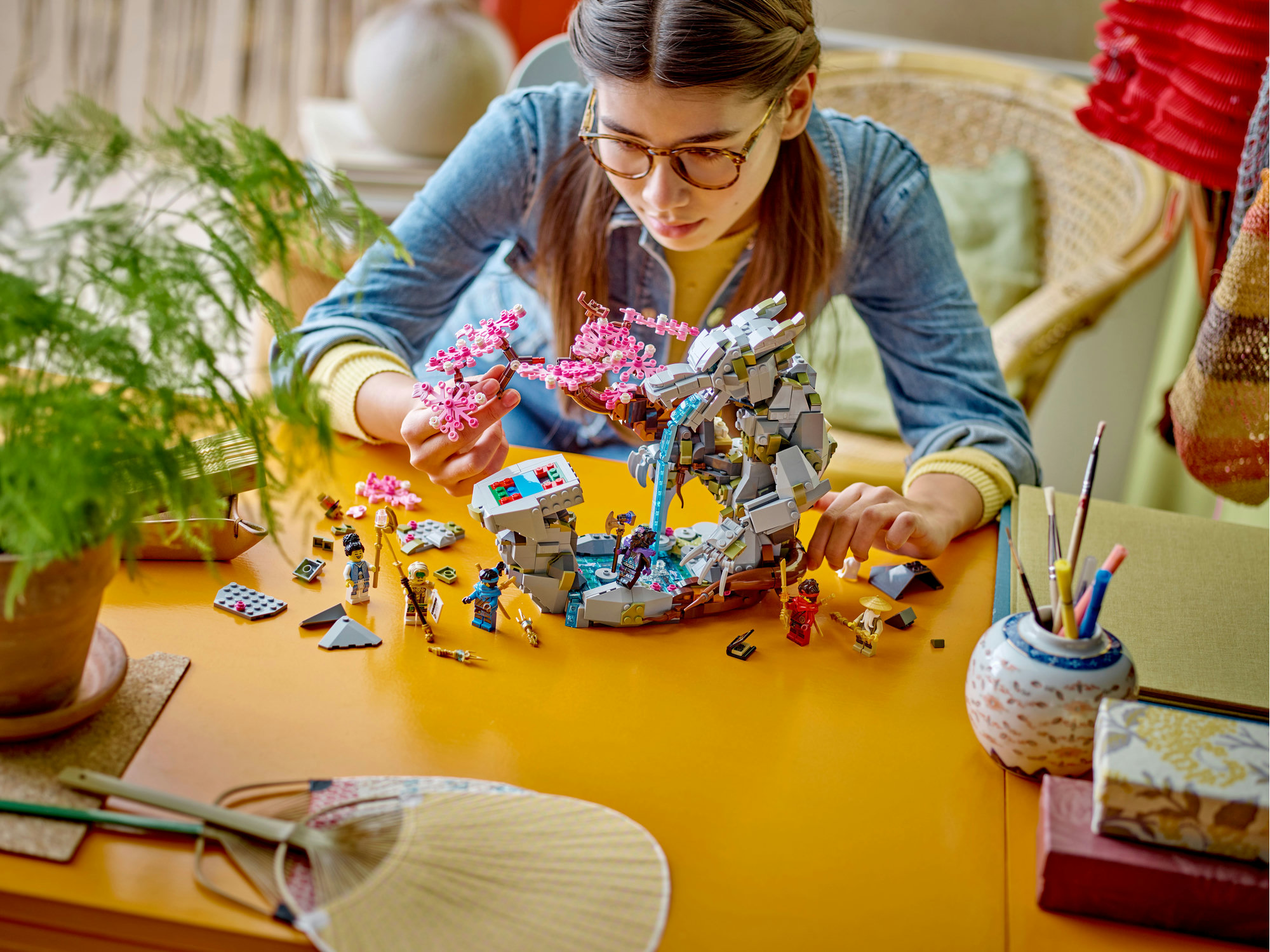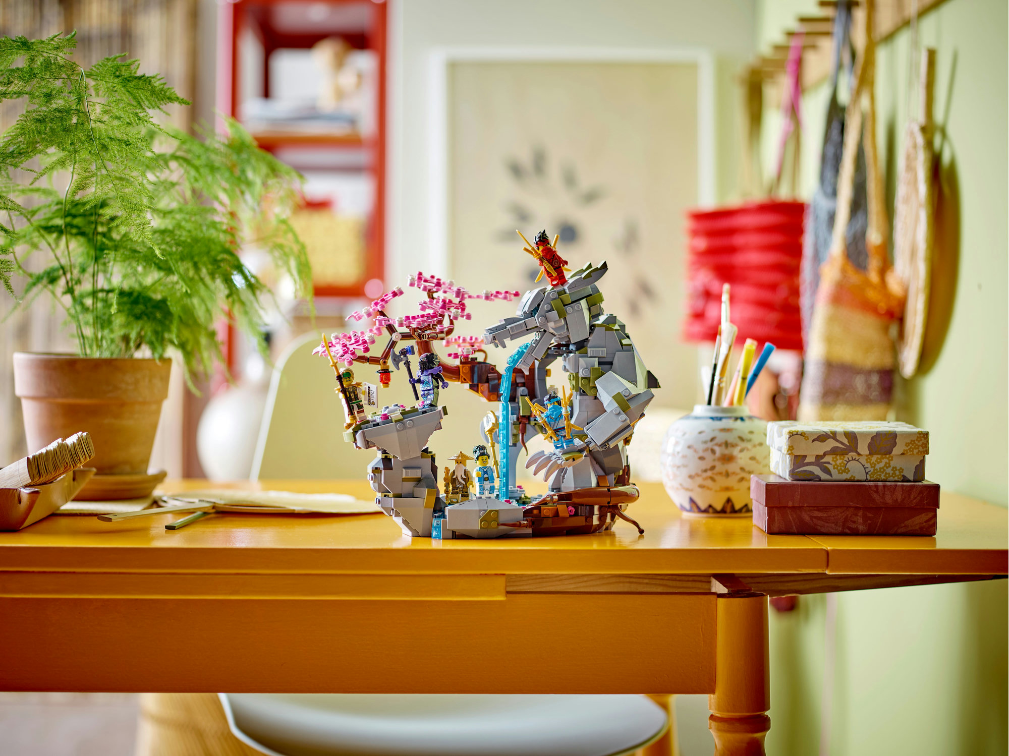 Kamplegetøj fyldt med detaljer – Sættet indeholder en stendrage, et vandfald, et kirsebærtræ, et bibliotek med skriftruller, bøger og et tesæt samt et hemmeligt rum