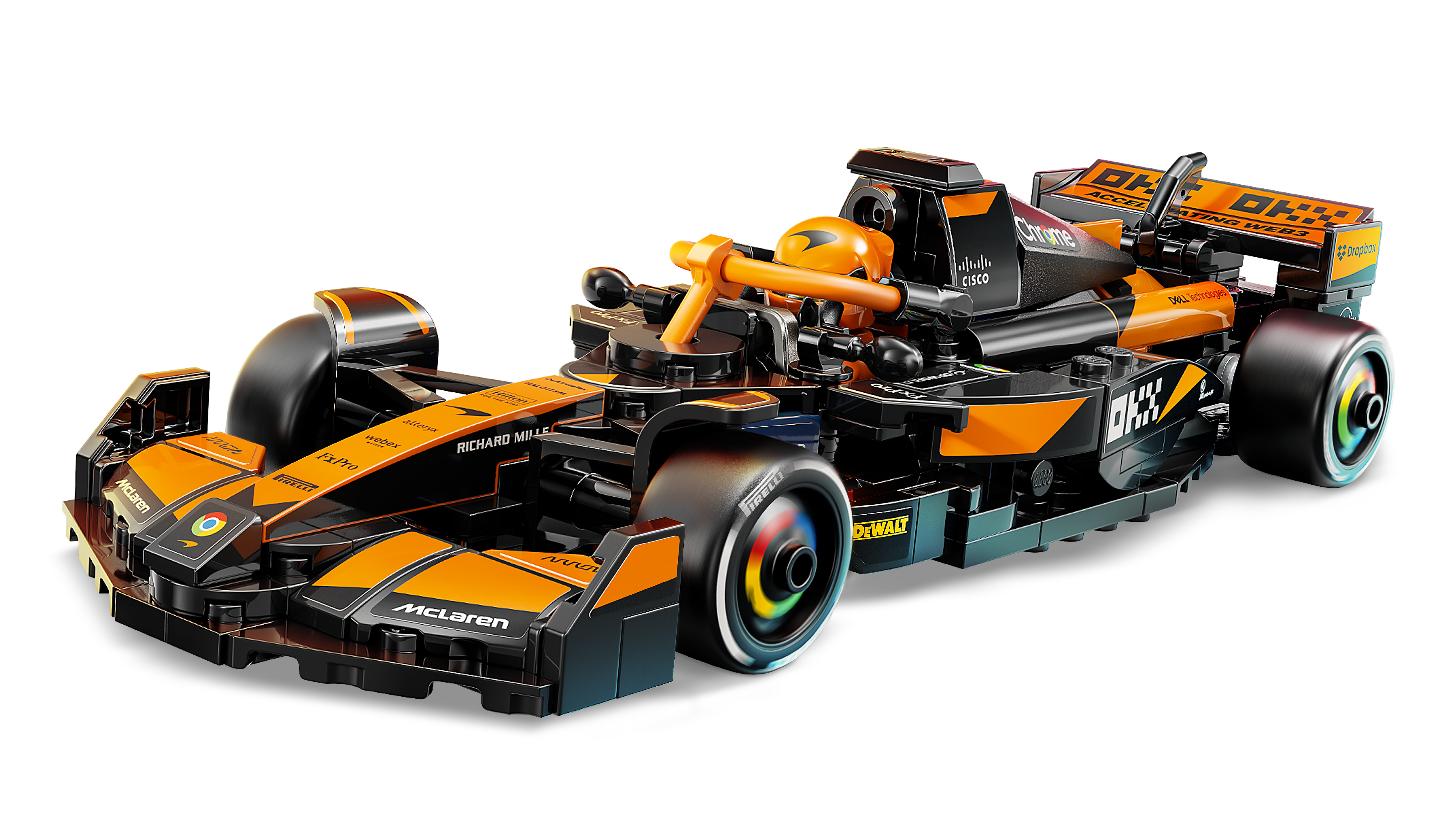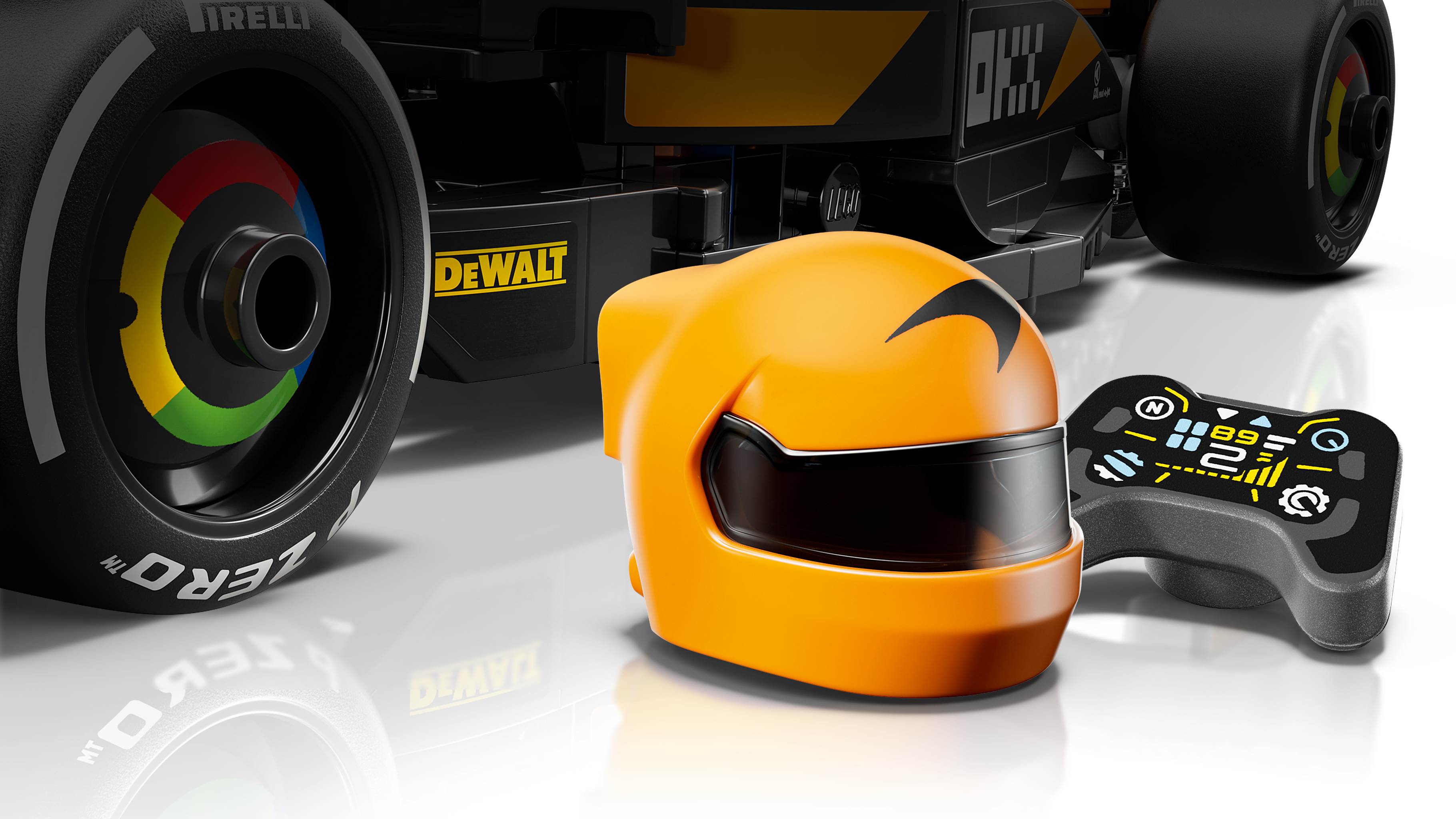 Autentiske detaljer kendt fra McLaren F1®-teamet – En McLaren F1-bil med detaljer fra virkelighedens 2024-version, heriblandt beskyttelsesbøjle, bagvinge, sponsorklistermærker og bredere bagdæk med "Pirelli" påtrykt.