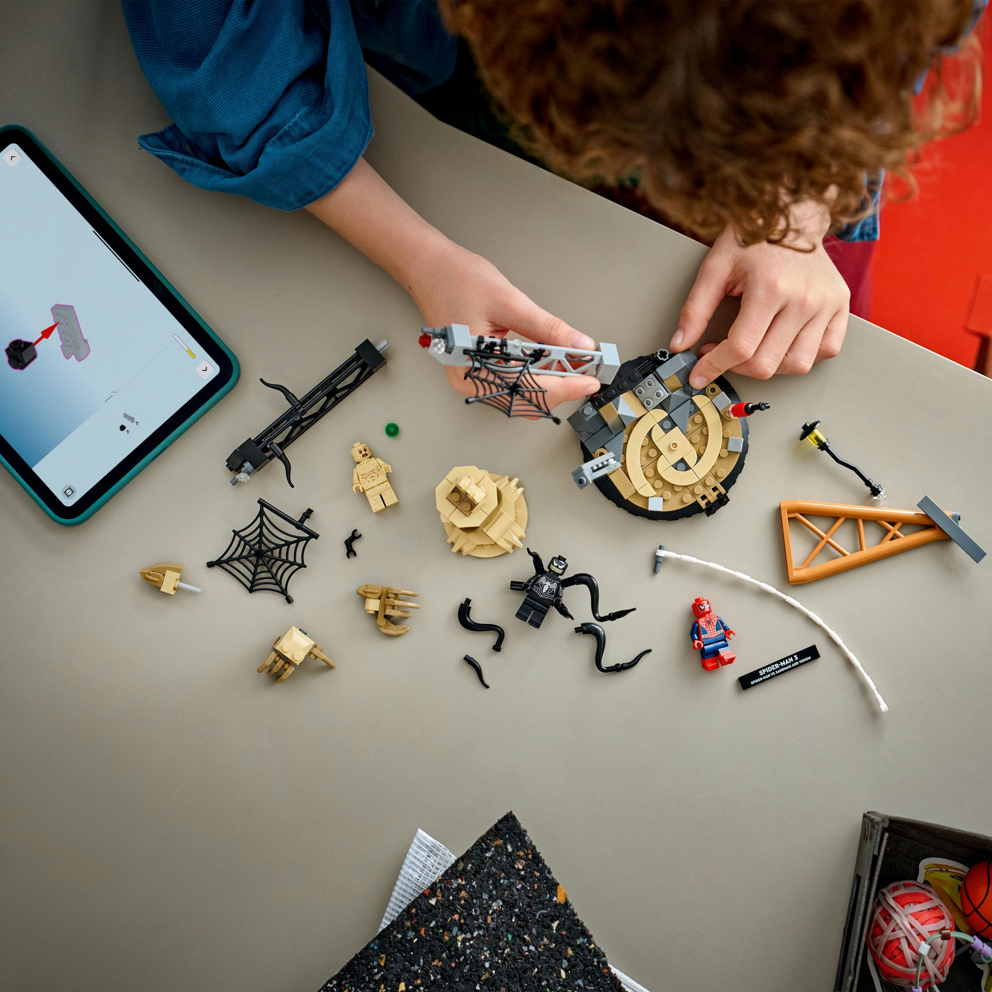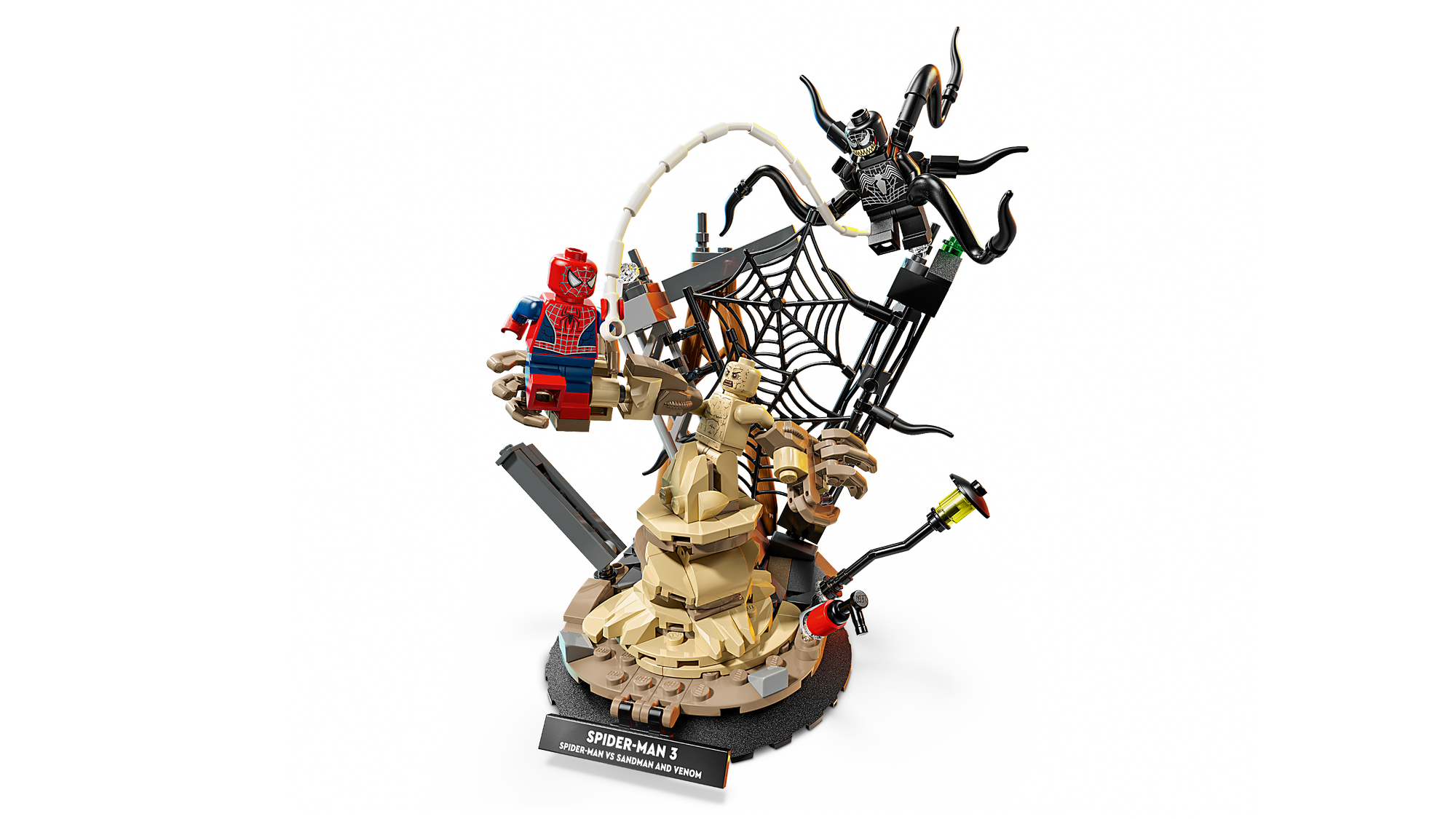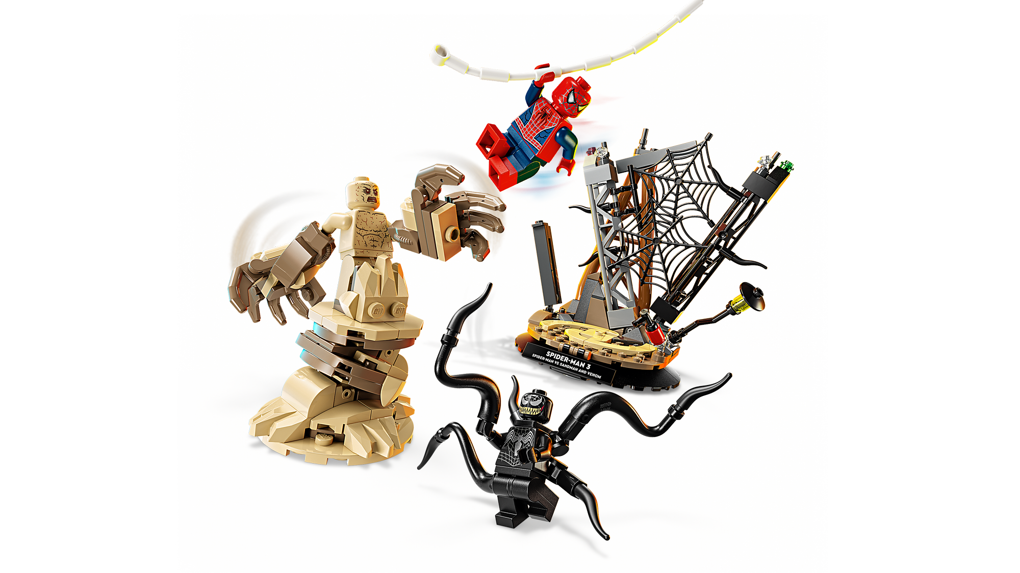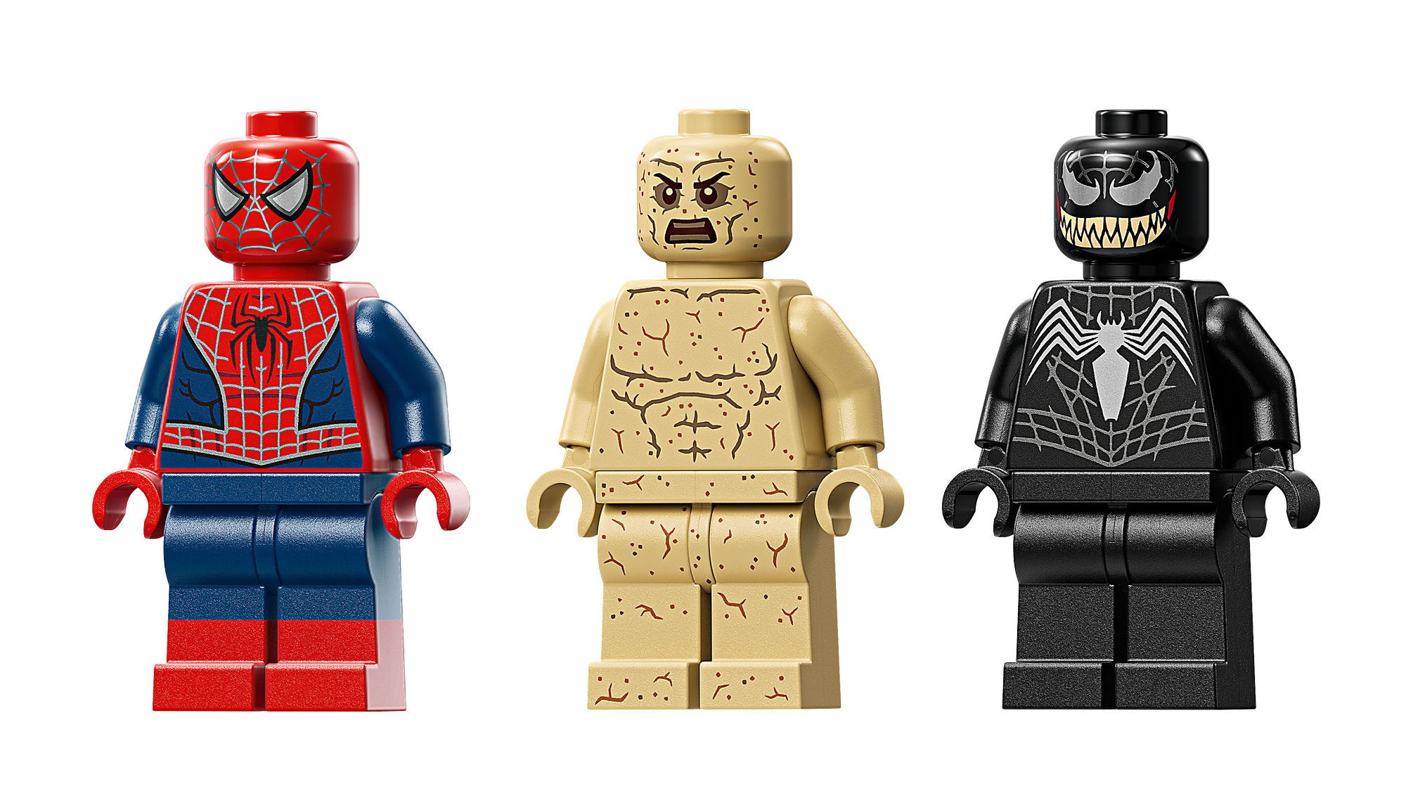 3 Lego® Marvel Minifigurer – Byggesættet indeholder 3 minifigurer, der kæmper på en byggeplads: Spider-Man, Venom med tentakler og Sandman med en klodsbygget base og en overdimensioneret arm.