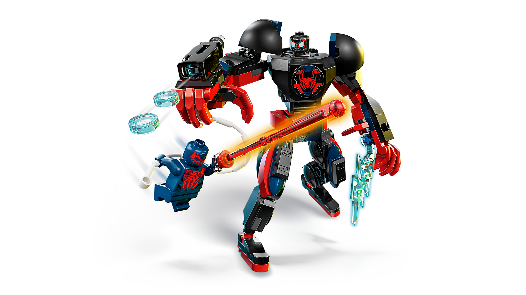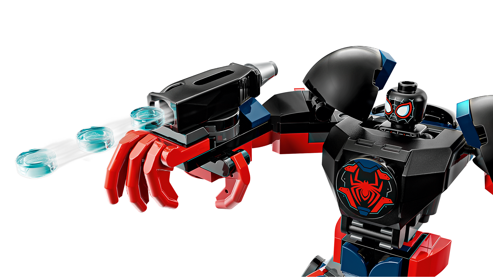 Tilbehør til Action – En kraftfuld 3-dobbelt knopskyder, netreb og udladninger af knivskarpe spindelvæv, der er fastgjort til Miles Morales-mech'ens arme, gør byggelegetøjet og minifigurerne levende i børns fantasi.