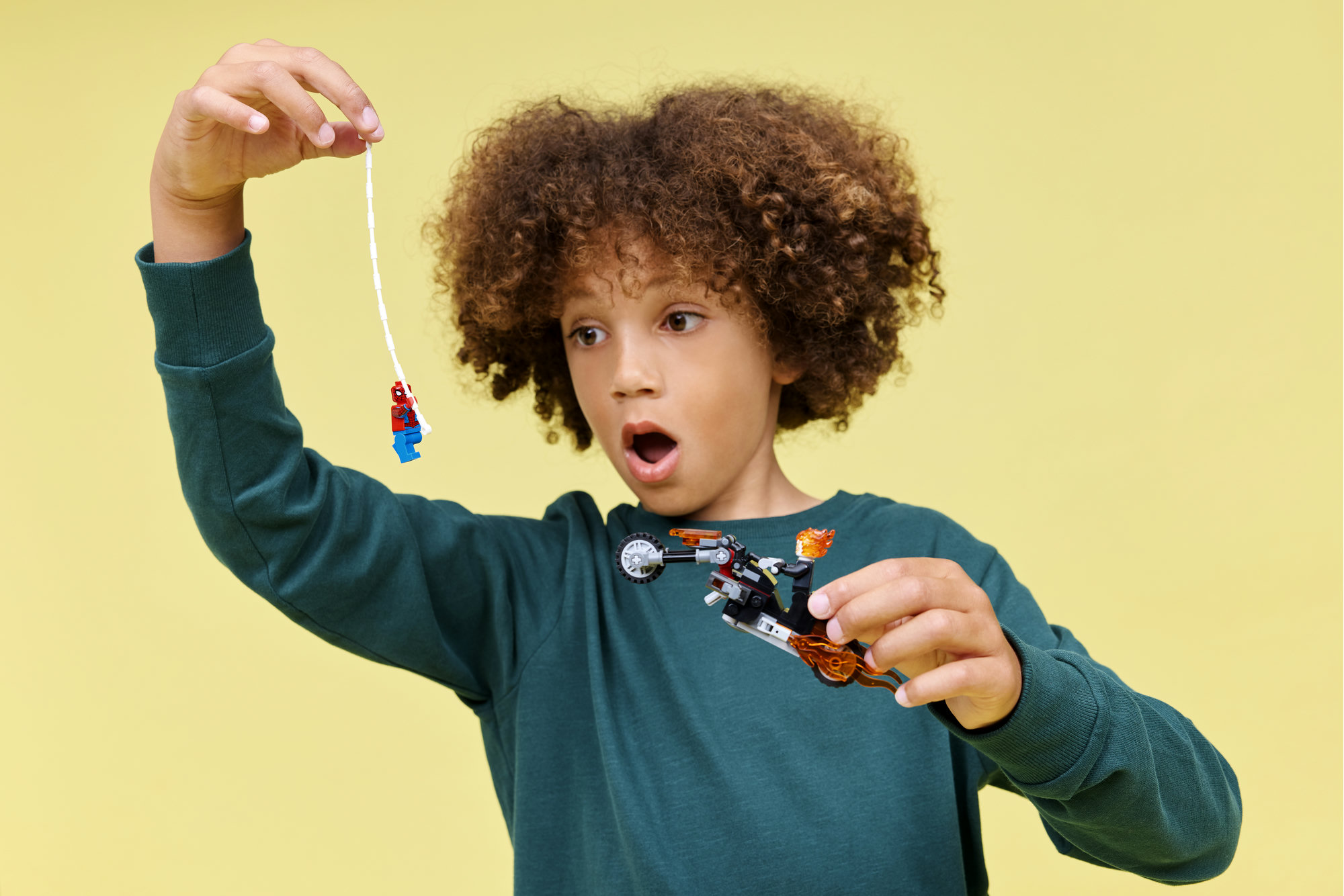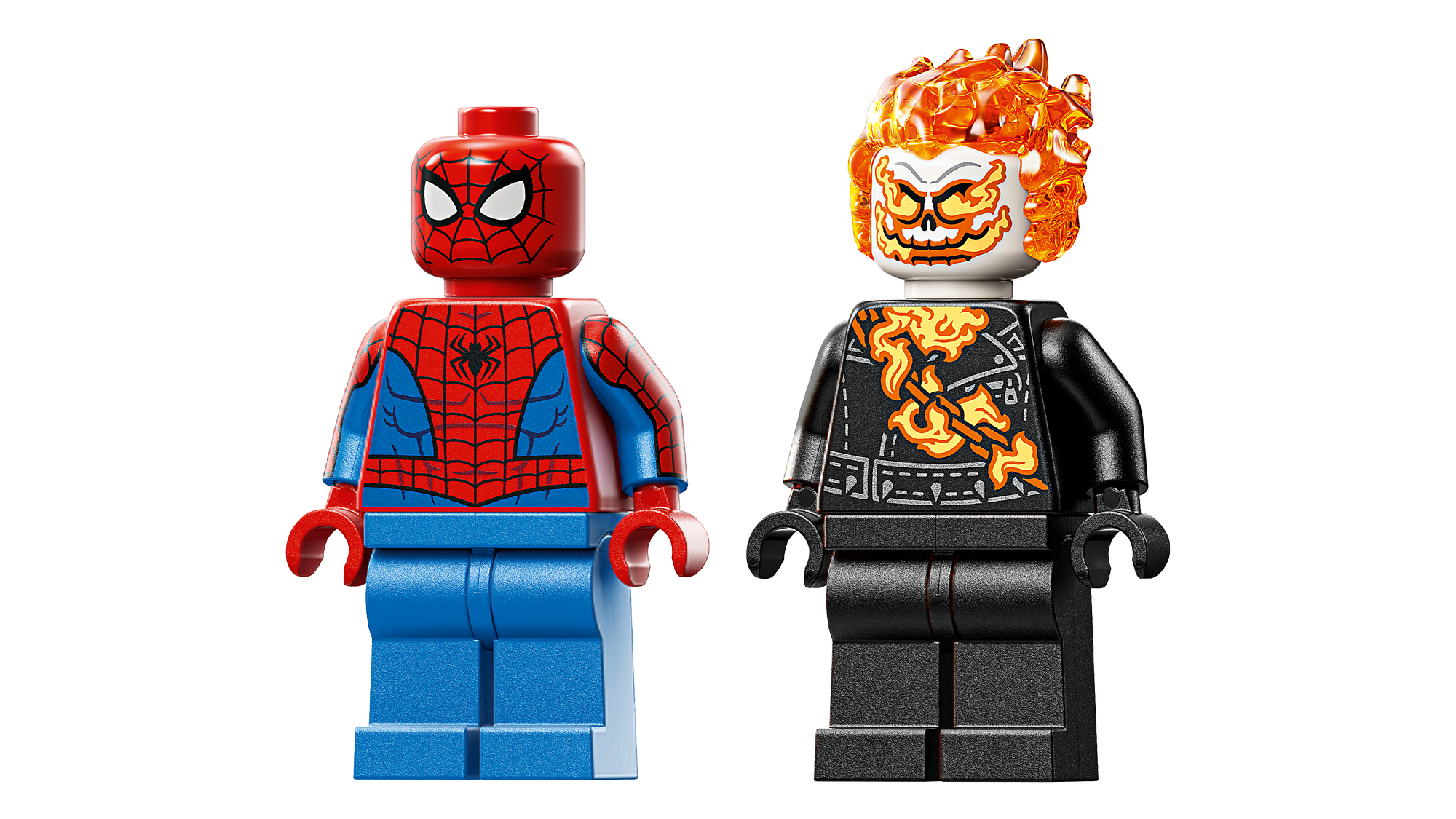 2 LEGO® ǀ Marvel Minifigurer – Spider-Man, der svinger i sit spindelvæv, og Ghost Rider, det flammehårede skelet, inspirerer børn til fantasifuld leg.