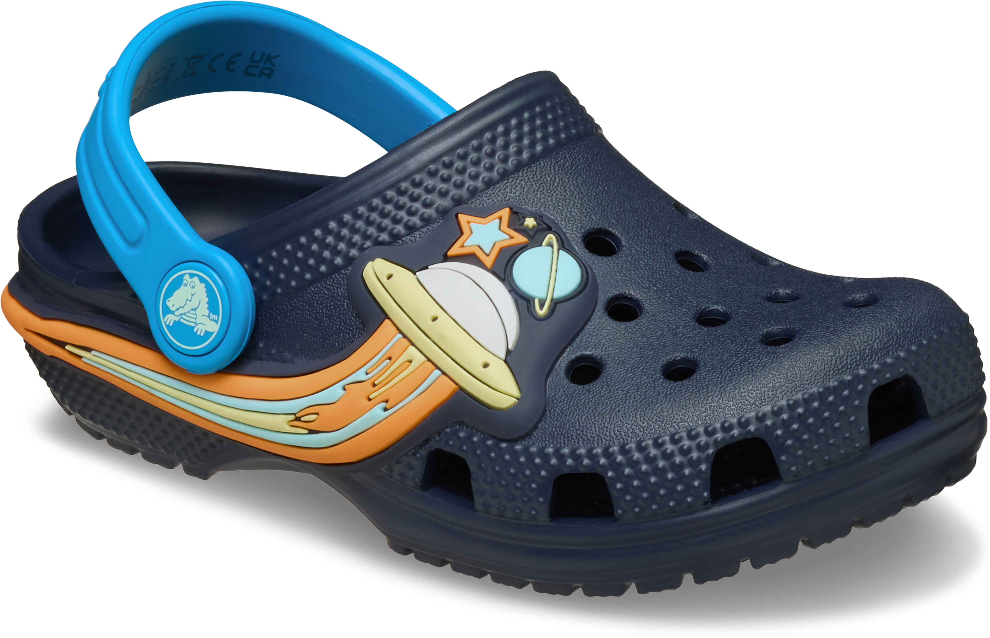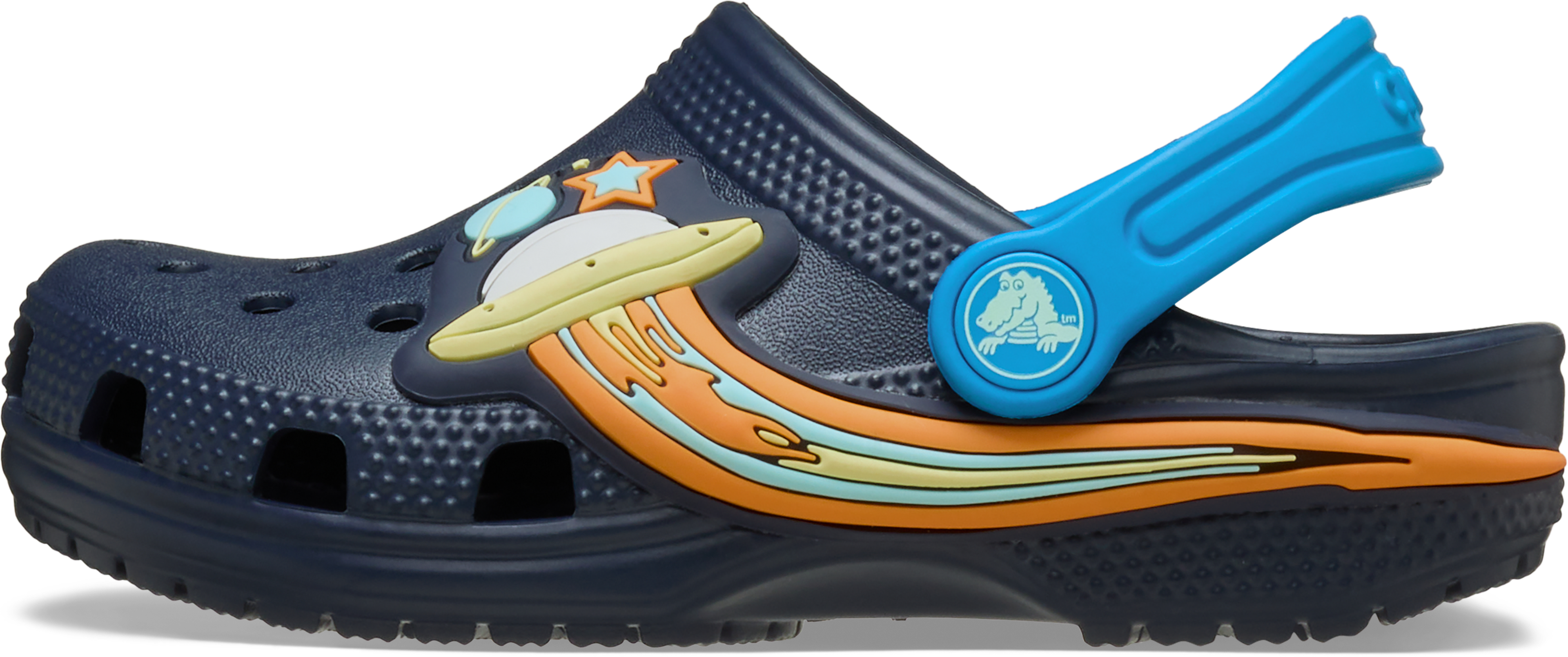 Crocs Classic UFO Lights T Clogs er det perfekte valg for dem, der søger både komfort og stil. Disse clogs fra Crocs er designet til at give maksimal komfort med deres letvægtsmateriale og hælrem, der sikrer en god pasform. Den enkle slip-on funktion gør det nemt og hurtigt at tage dem på og af, mens de strategisk placerede lufthuller sikrer åndbarhed hele dagen.
