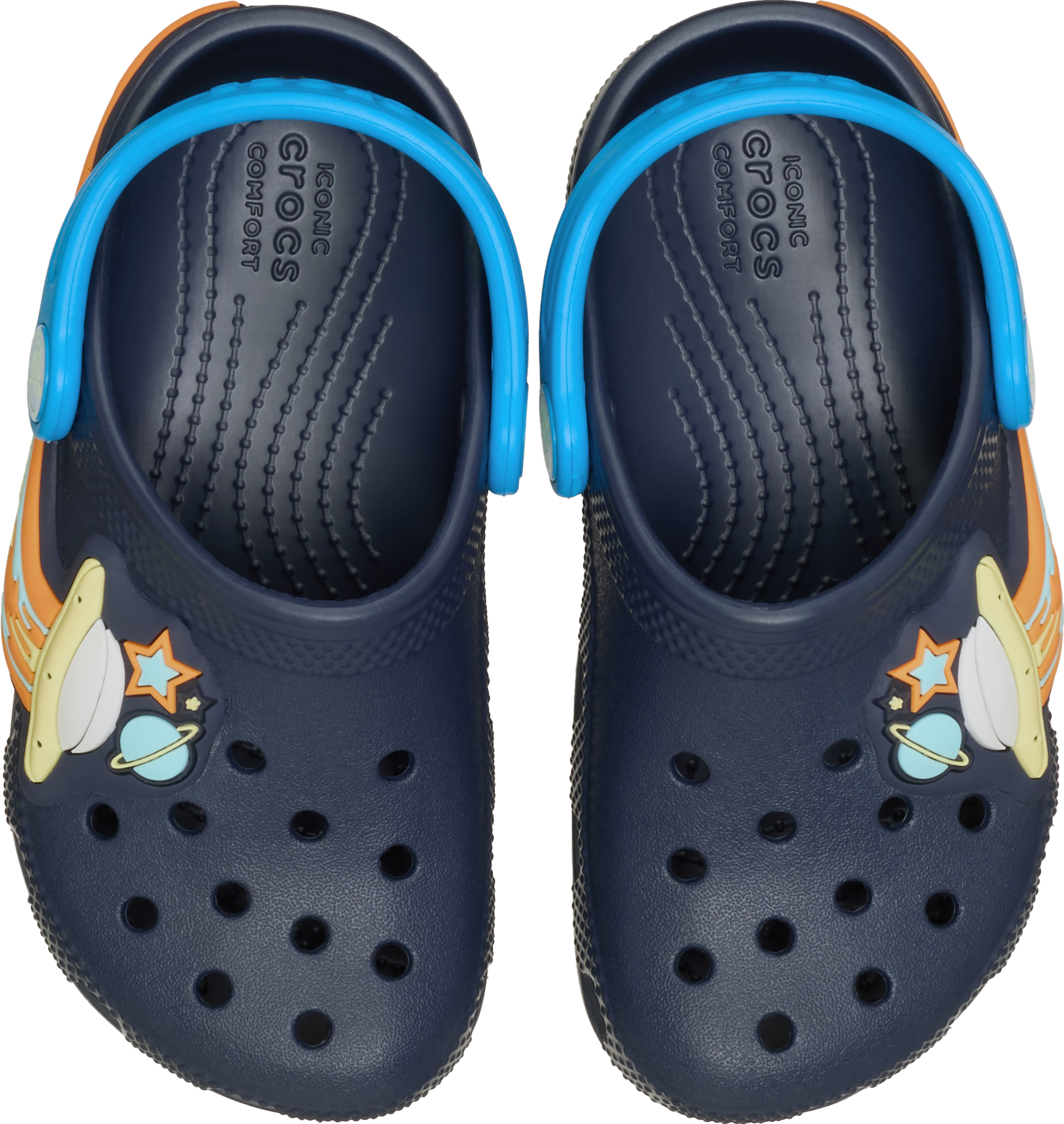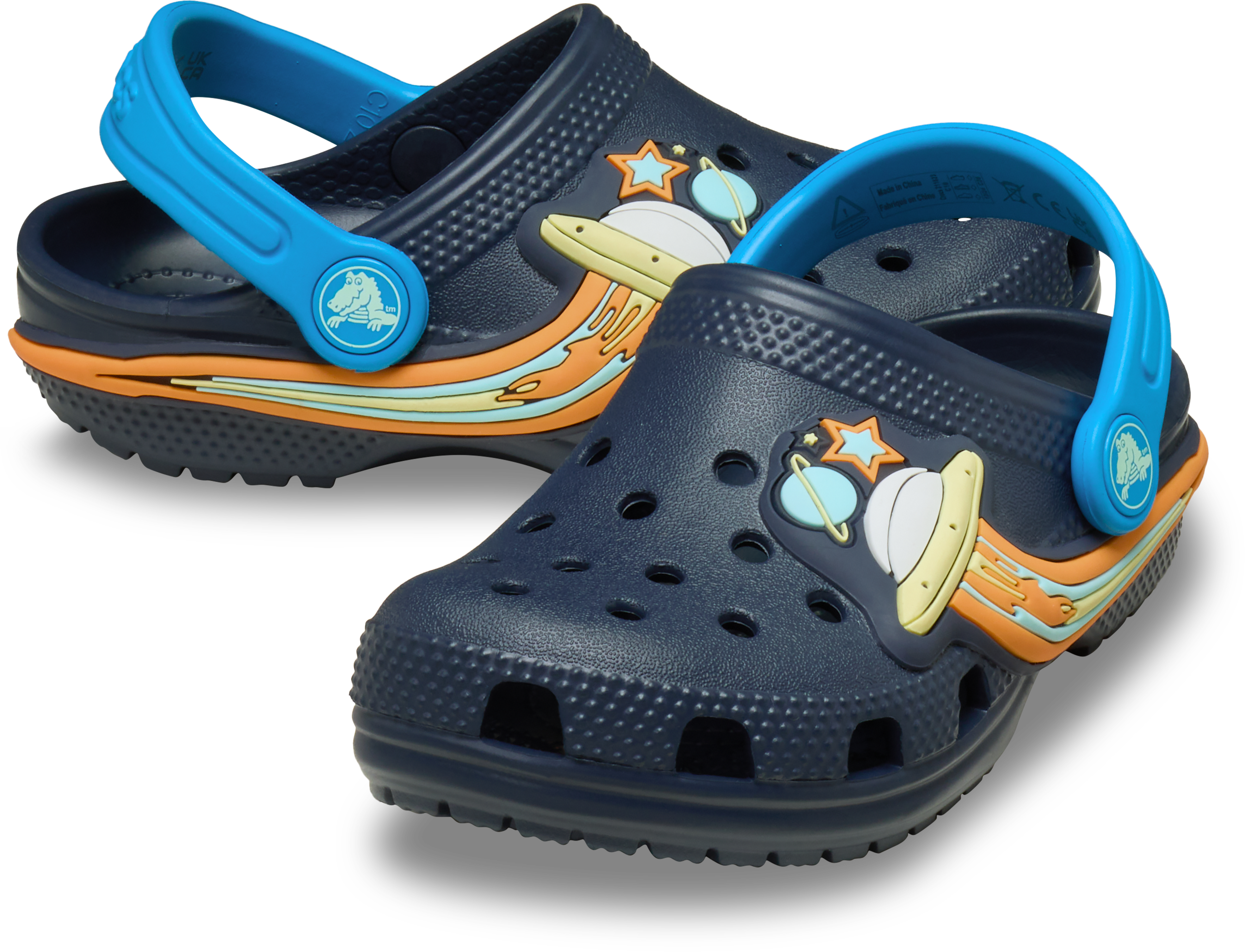 Med en rund snude og unikke detaljer, der inkluderer stjerner, planet og en lysende UFO, tilbyder disse clogs ikke kun komfort, men også et spændende og unikt udseende, der fanger opmærksomheden. Lysende UFO-detaljen tilføjer et sjovt element, der gør dem ideelle til børn, der elsker at have noget ekstraordinært i deres garderobe. Sammenfattende kombinerer Crocs Classic UFO Lights T Clogs funktionalitet og sjov på en måde, der vil begejstre både store og små.