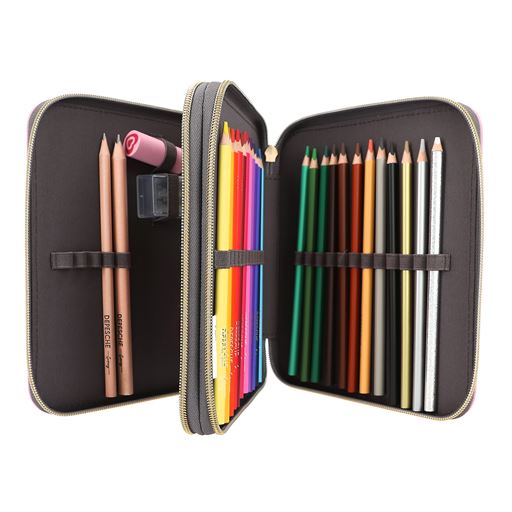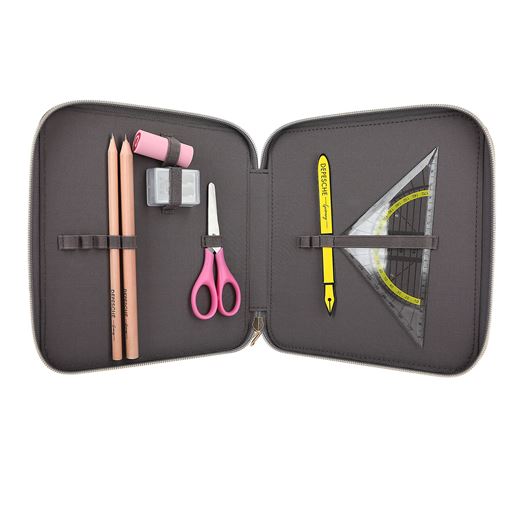 - Indeholder blyanter, blyantspidser, viskelæder, lineal, saks og 24 farveblyanter
