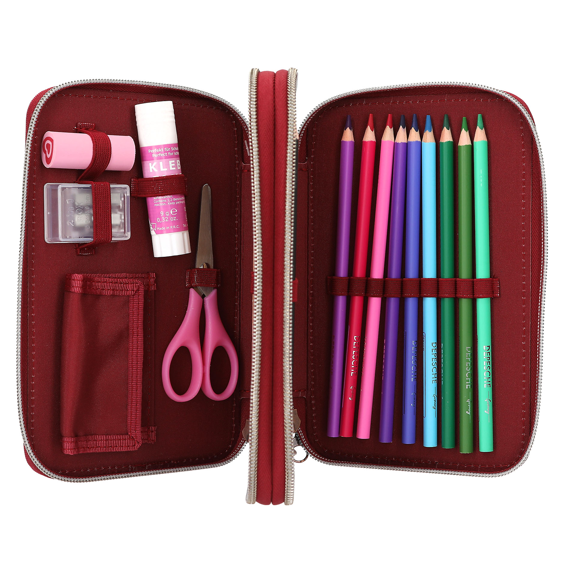 Inde i penalhuset finder du et velassorteret udvalg af skriveredskaber og værktøj: 2 blyanter til skriftlige opgaver, en blyantspidser, så blyanterne altid er skarpe, og et viskelæder til hurtige rettelser. Penalhuset indeholder også en lineal til præcise linjer, en saks til kreative projekter, og en limstift til at fæstne dine kreationer. Derudover er der inkluderet 18 farveblyanter, perfekt til at tilføje lidt farve til opgaverne.