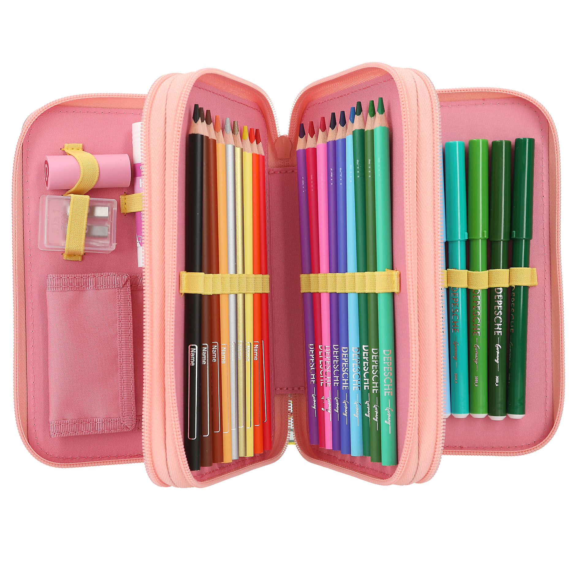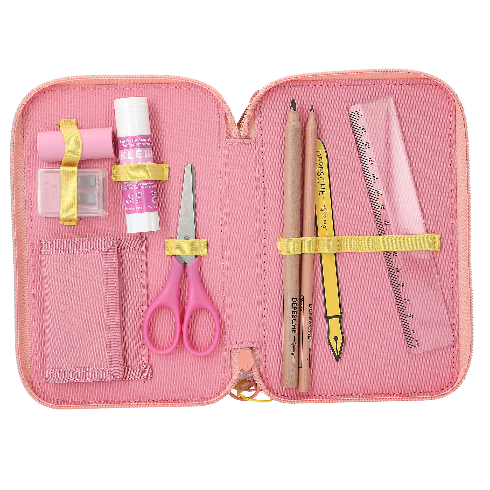 Penalhuset er praktisk opdelt i tre separate rum, hver med lynlåslukning, hvilket gør det nemt for dit barn at holde styr på sine skriveredskaber. Det omfattende indhold inkluderer alt, hvad dit barn behøver til en kreativ dag i skolen eller derhjemme: blyanter, saks, lineal, viskelæder, blyantspidser, 18 farveblyanter og 18 tuscher. Derudover har det en lille pung med velcro, perfekt til opbevaring af små ting. Med en størrelse på 20 x 13 x 7,5 cm er dette penalhus tilstrækkeligt rummeligt uden at være for omfangsrigt. Giv dit barn en skoledag fyldt med farver og sjov med Juicy Tripple Penalhuset fra Topmodel.