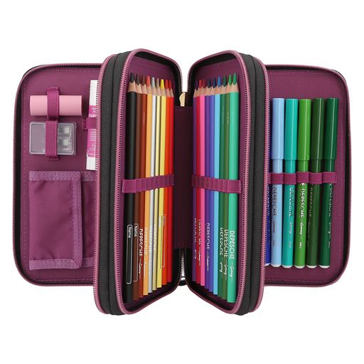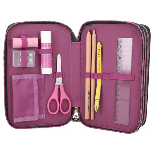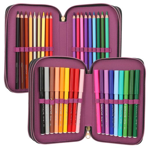 - Fyldt med saks, lineal, viskelæder, blyantspidser, 2 blyanter, 18 farveblyanter og 18 tuscher
