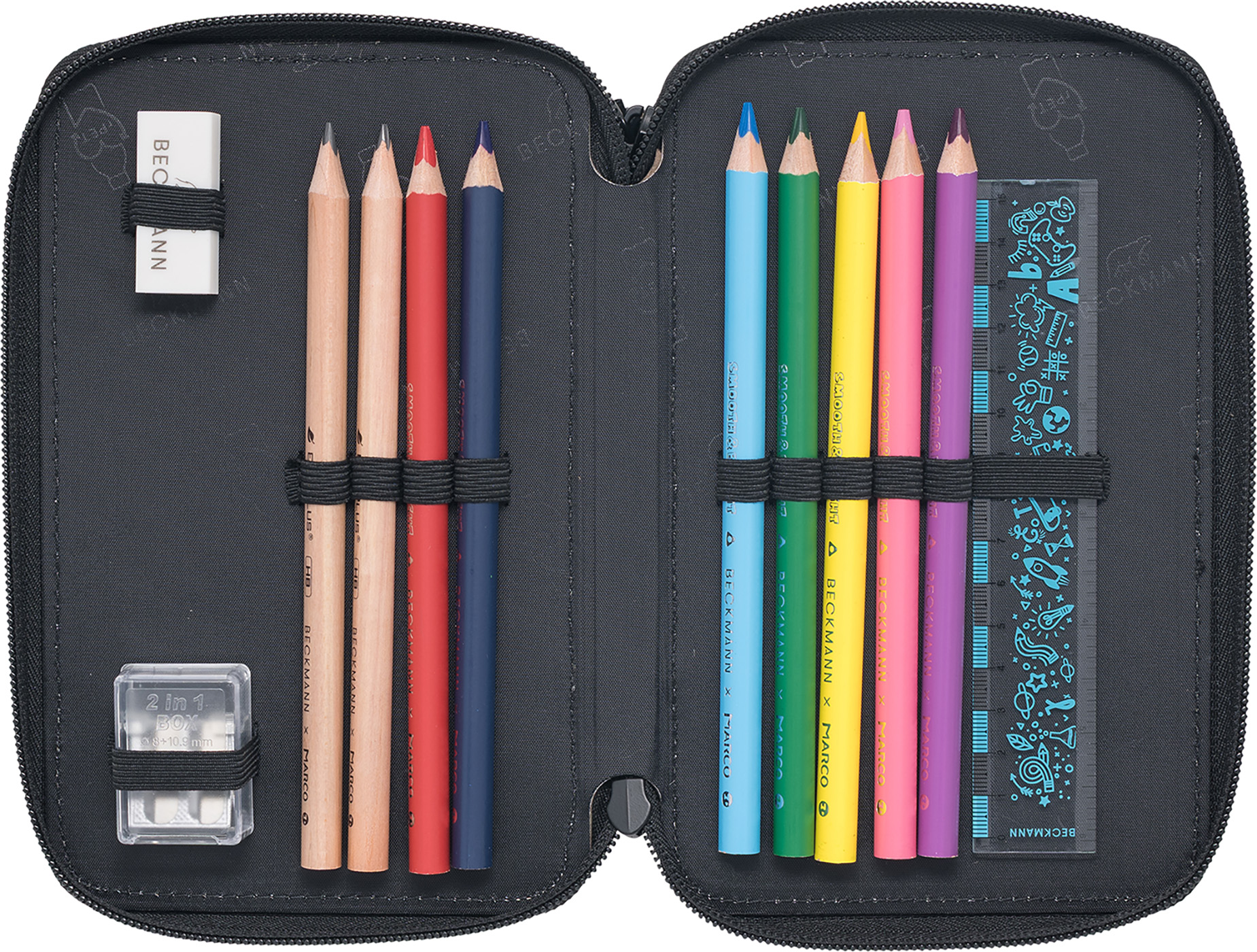 Penalhuset er udstyret med farveblyanter og jumbo farveblyanter, hvilket giver dit barn mulighed for at udtrykke deres kreativitet både i og udenfor klasselokalet. Derudover indeholder det også et viskelæder og en lineal, som er essentielle værktøjer til præcise skrive- og tegneopgaver. Blyantspidseren sikrer, at blyanterne altid er klar til brug, og med det medfølgende skoleskema og noteblok har dit barn nemt ved at få overblik over ugens aktiviteter og opgaver. Penalhuset fra Beckmann er en pålidelig følgesvend til enhver skoledag.