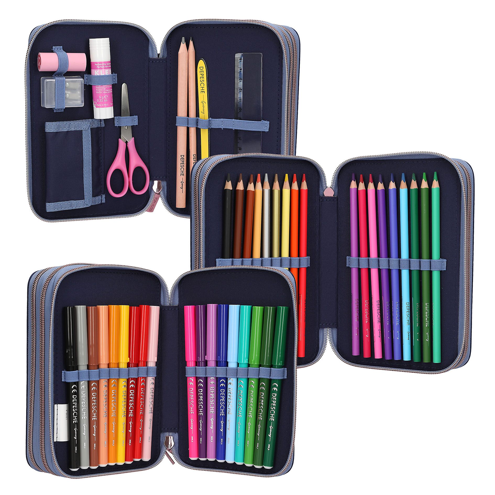 - Indeholder: saks, lineal, viskelæder, blyantspidser, 2 blyanter, 18 farveblyanter og 18 tuscher
