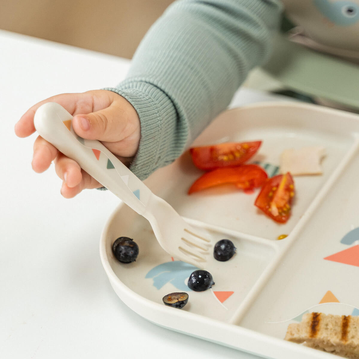Bestiksættet fra Done by Deer er specielt designet til at gøre måltiderne både sjovere og mere praktiske for dit barn. Dette sæt er lavet til at passe perfekt i små børnehænder, hvilket gør det lettere for dem at lære at spise selv. Sættet indeholder en ske, en kniv og en gaffel, alle med afrundede kanter for at sikre en sikker spiseoplevelse.