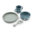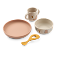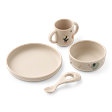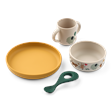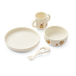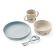 - Indeholder 4 dele (ske, krus, skål og tallerken)