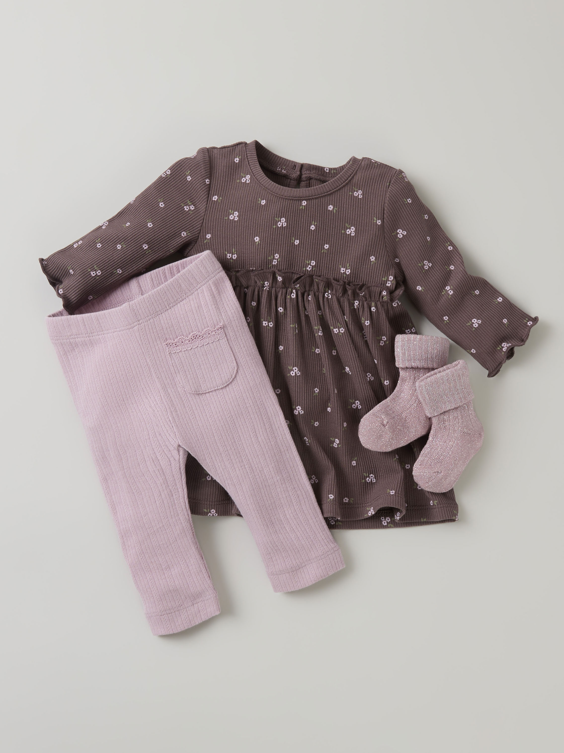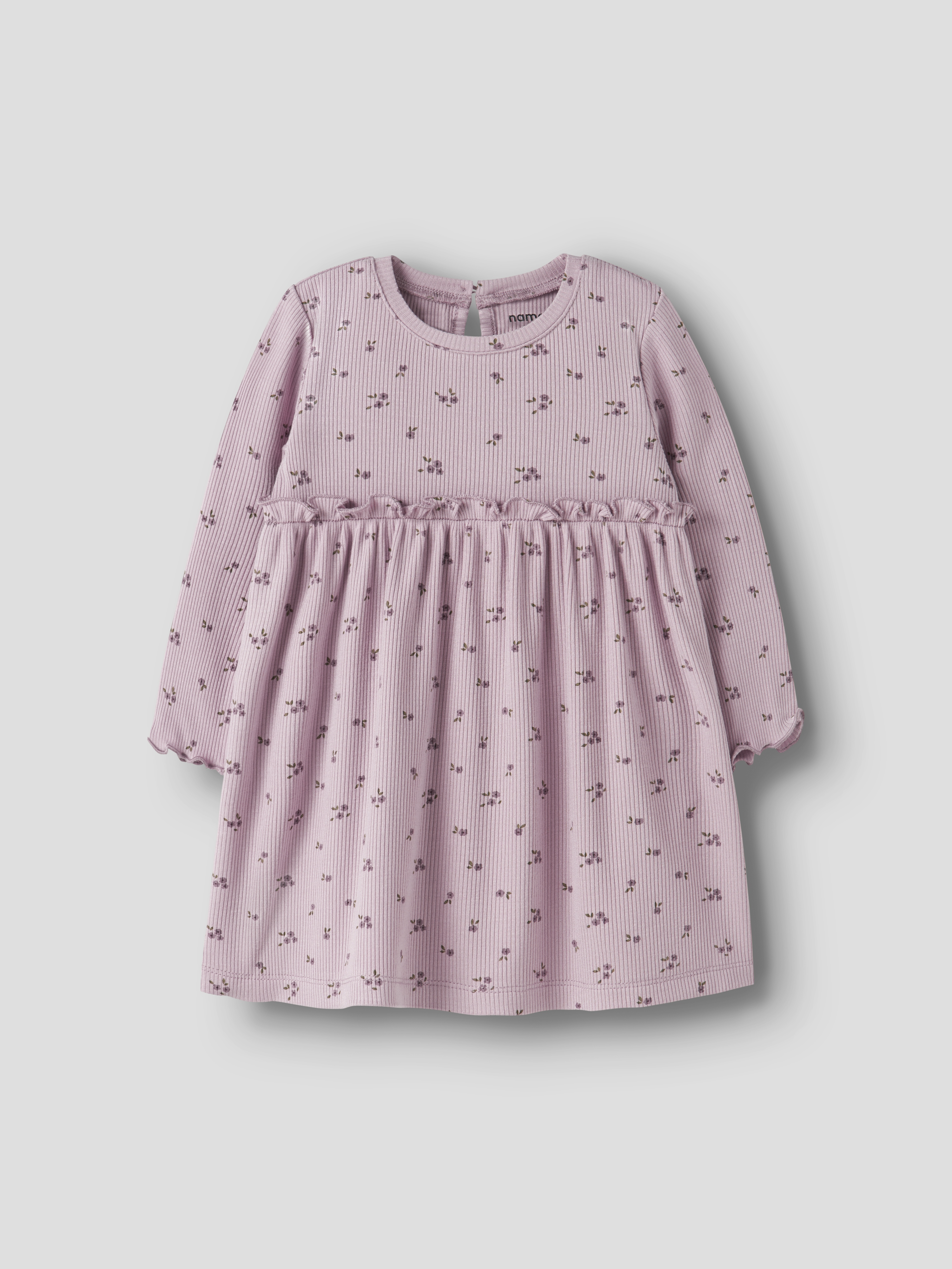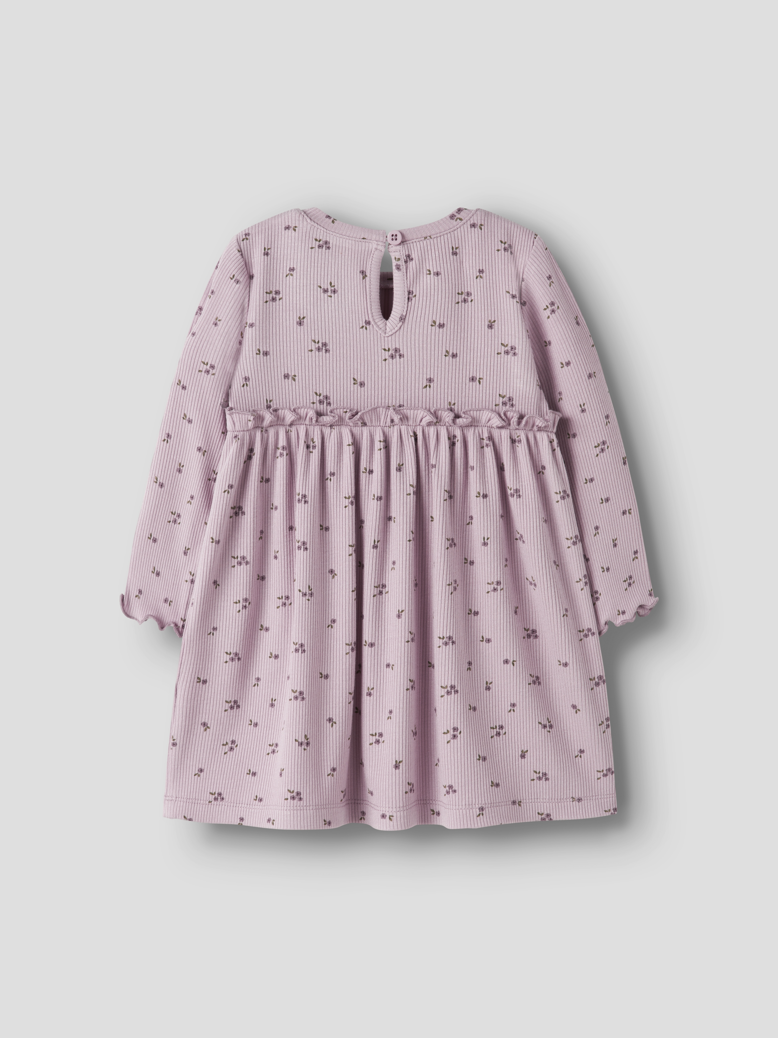 Den elastiske ribstrik sikrer en behagelig pasform, mens de lange ærmer og den runde hals giver en klassisk og tidløs silhuet. Flæse detaljerne tilføjer en fin og feminin touch, som gør kjolen ekstra speciel. Lavet af en blød blanding af viskose og elastan, føles kjolen behagelig mod huden og giver frihed til leg og bevægelse.