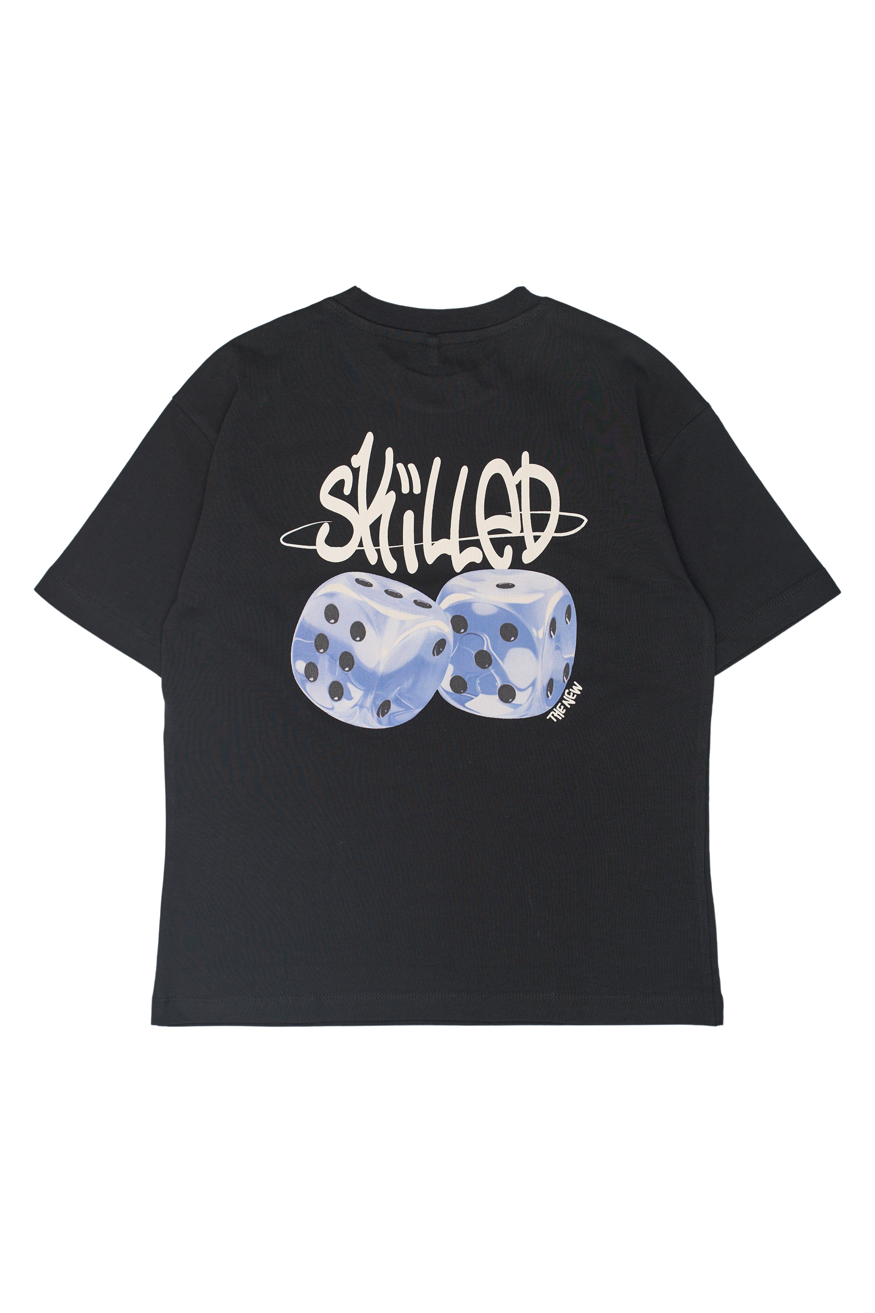 - Print med to terninger og et stort "SKILLED" grafisk design bagpå