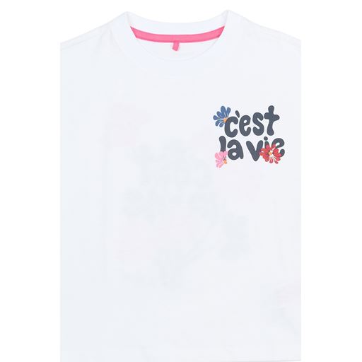 - Lille brystprint med teksten “c’est la vie” og små blomster