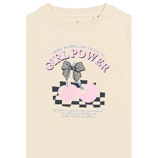 - Frontprint med “GIRL POWER”, kirsebær og grafiske tern