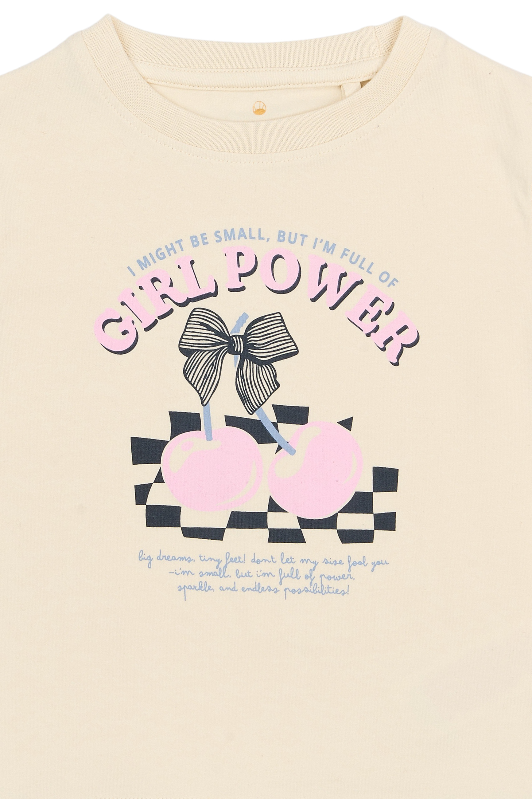 - Frontprint med “GIRL POWER”, kirsebær og grafiske tern
