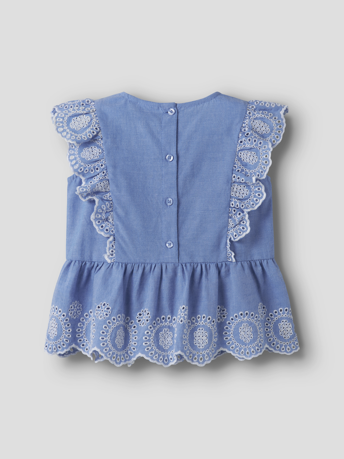 - Broderie anglaise detaljer ved flæserne og bund