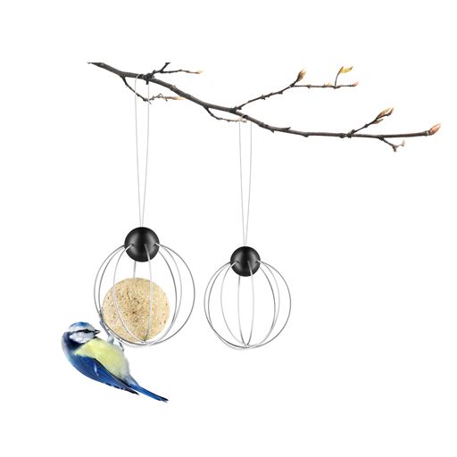 Mejsekugleholderne fra Eva Solo. Holderen er designet så mejsekuglen ikke falder ud, og samtidig er den nem at hænge op i haven eller på altanen. Holderen sikrer også at større fugle ikke flyver væk med mejsekuglen.
